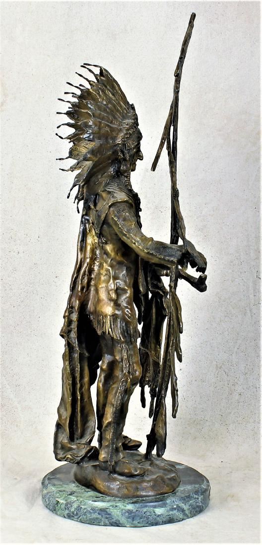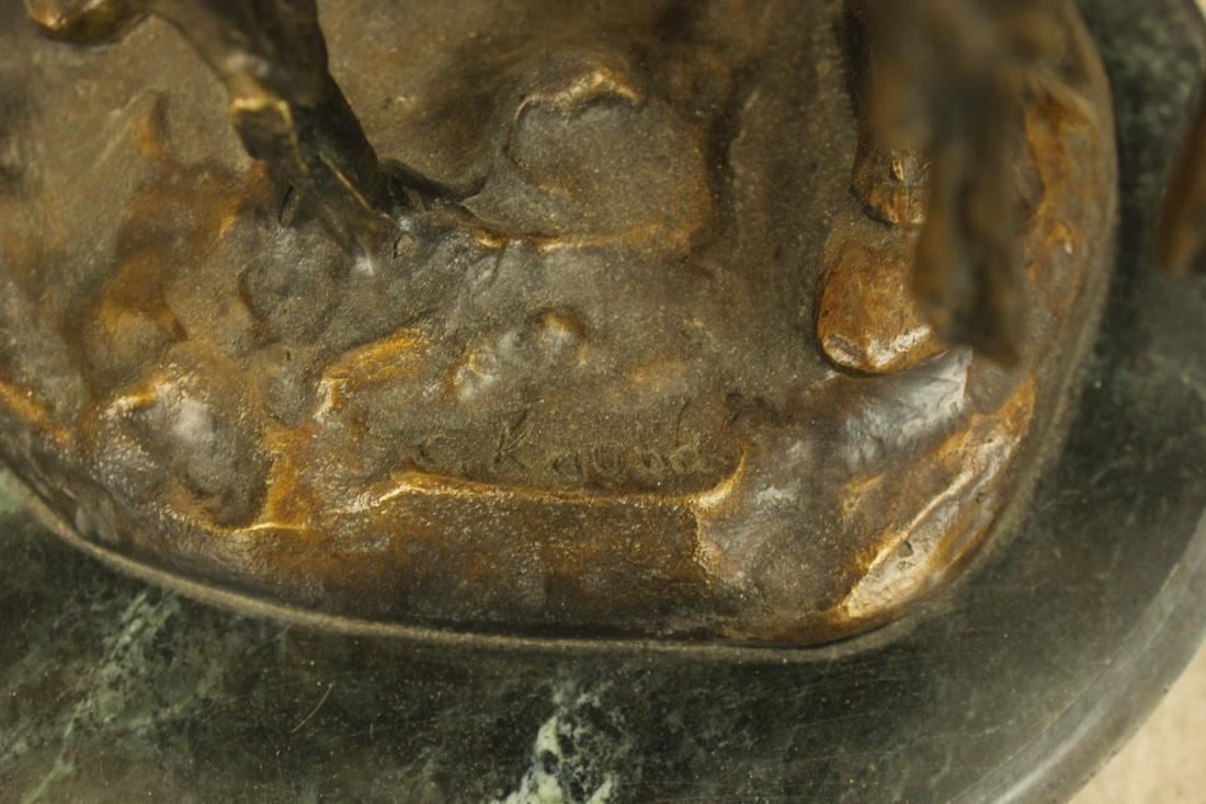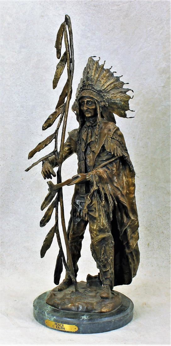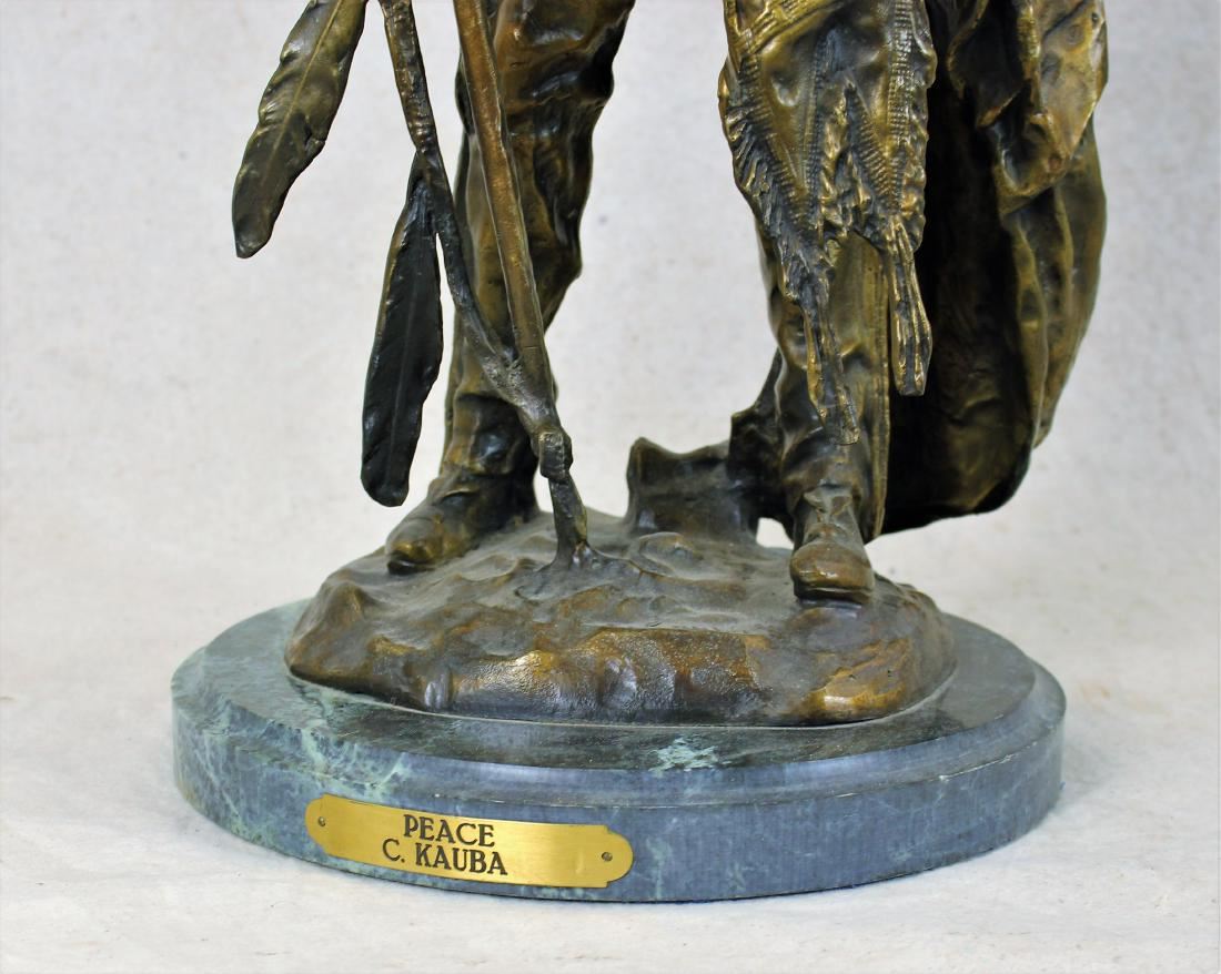 Bronze sculpture with inscribed signature of the artist, Carl Kauba (Austrian, 1865-1922) on the natural base. Mounted on green marble circular base. Titled "Peace". Standing 28 1/2" tall. Showing a wonderful patina.