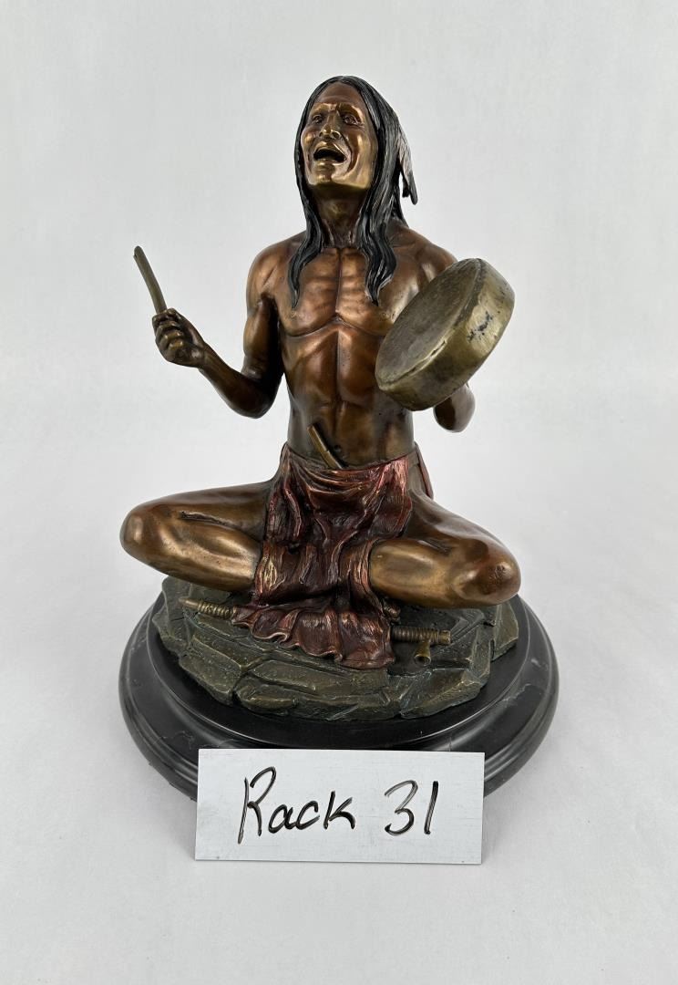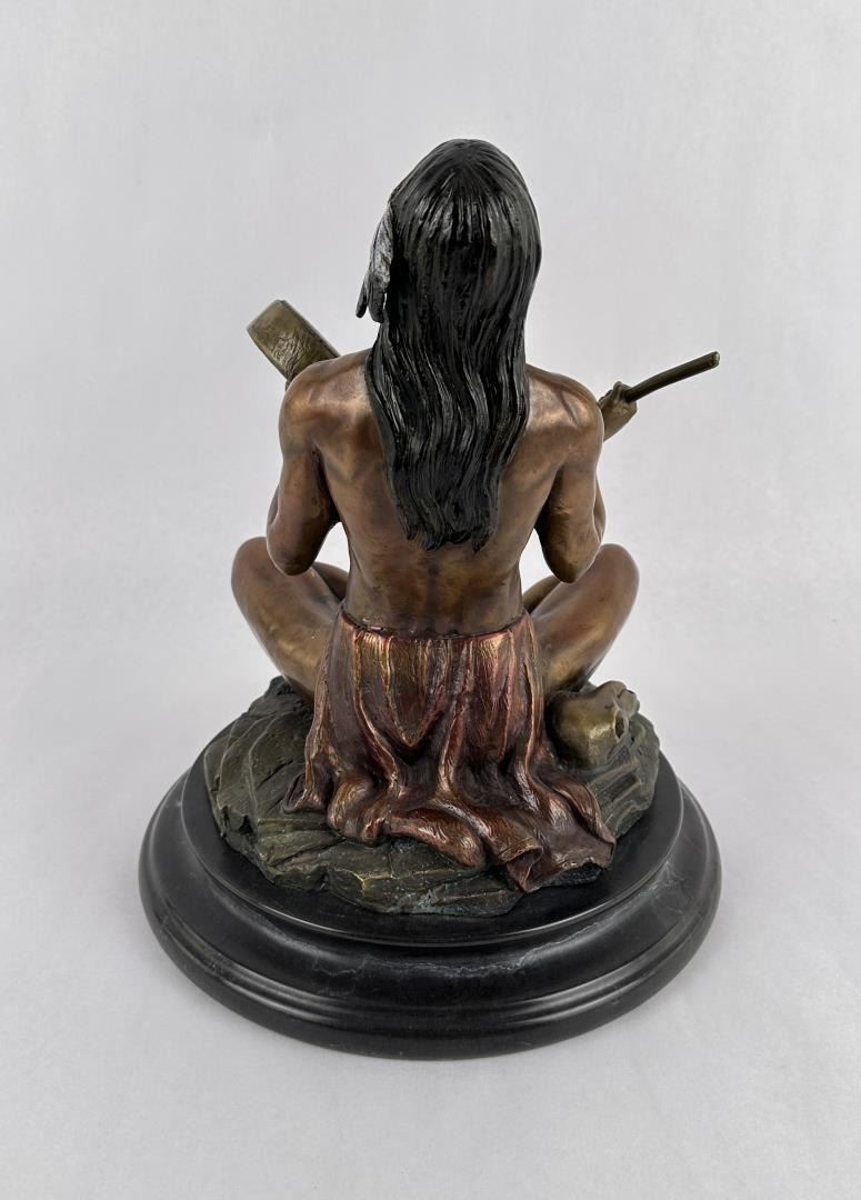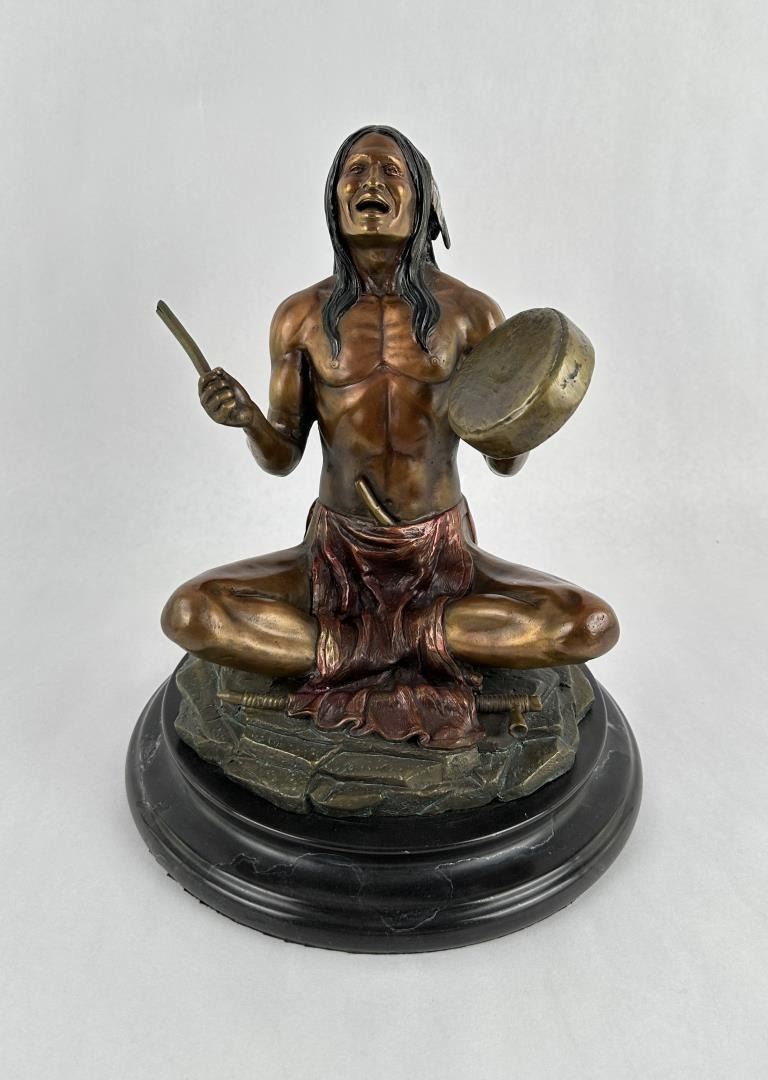 12 1/2" tall, 10 1/2" diameter. Carl Kauba (1865 - 1922) was active/lived in Austria, United States. Carl Kauba is known for Sculpture-western figure, Native American. This Austrian sculptor was born in Vienna in 1865. His teachers were Karl Waschmann (1848-1905), known for his ivory sculptures and portrait plaquettes of contemporary celebrities, and Stefan Schwartz (1851-1924), who exhibited in Paris, including the Exposition Universelle of 1900 where he won a gold medal. Kauba's intricate bronzes, imported to the United States between 1895 and 1912, were cast at the Roman Bronze Works. Kauba was part of the nineteenth-century tradition of polychrome bronze sculpture. There were several types of patinas on a single statue: he could render the color of buckskin, variously tinted shirts, blankets, feathers, as well as beaded moccasins. Reportedly, Kauba came to America around 1886. Inspired by the Western tales of German author Karl May, he traveled to the West and made sketches and models. Critics, however, pointed out inaccuracies of costume and other details. For instance, the guns that his "mid-nineteenth-century" figures use are models produced after 1898. Apparently he did all of his works back in Vienna. Besides the variety of color, Kauba's bronzes show a great range of textures and his style is highly naturalistic. The sculptor loved ornament, some of which he rendered with coiled wire for reins, rope and feathers in headdresses. He successfully rendered figures in motion and often executed compositions with more than one figure. Berman (1974) illustrates non-Western subjects by Kaula, such as the pendants Where? and There (ca. 1910), a seated Scottish couple, impressive in the expressions and the details on patterned fabrics of both sitters. Another genre piece is Buster Brown, ca. 1910, and Nude on Vase shows Kauba's versatility even further. The smooth skin contrasts with the stylistic, plant-like vase.