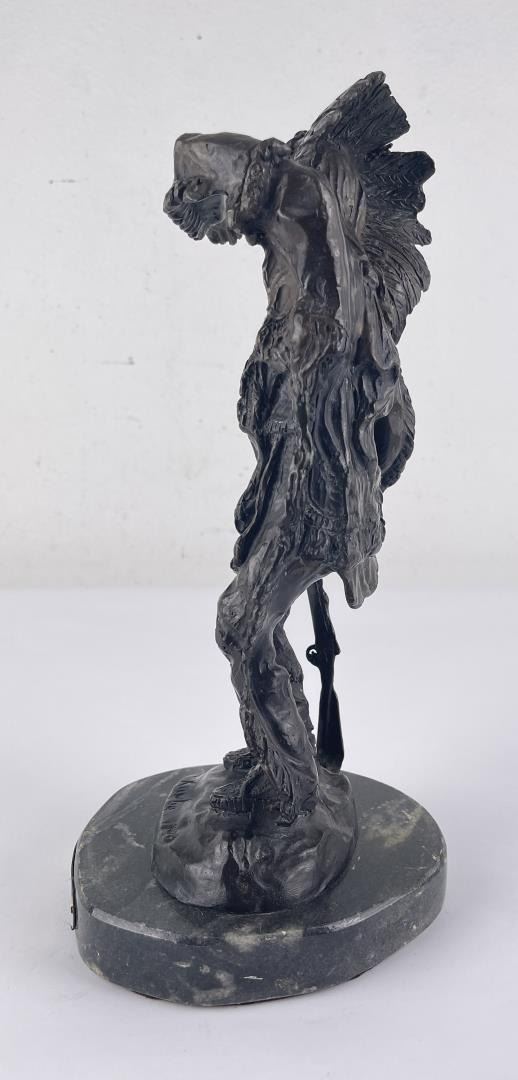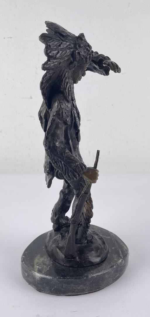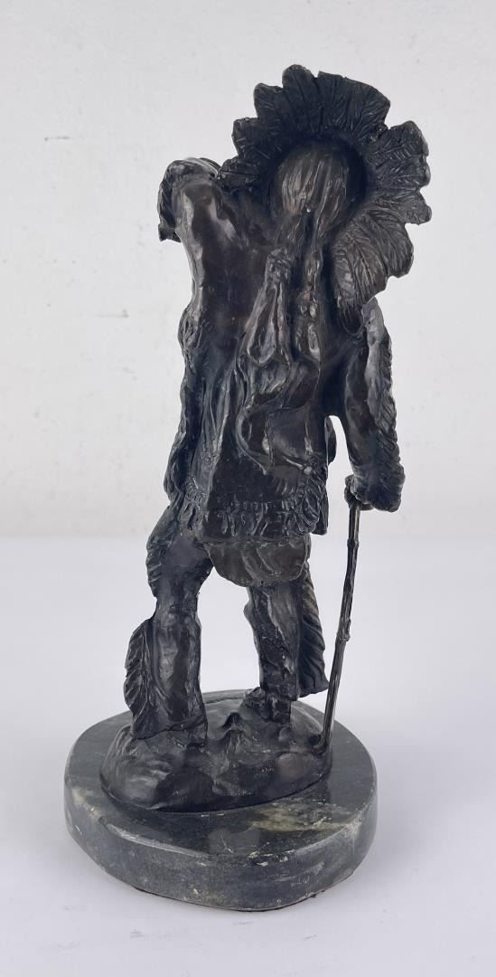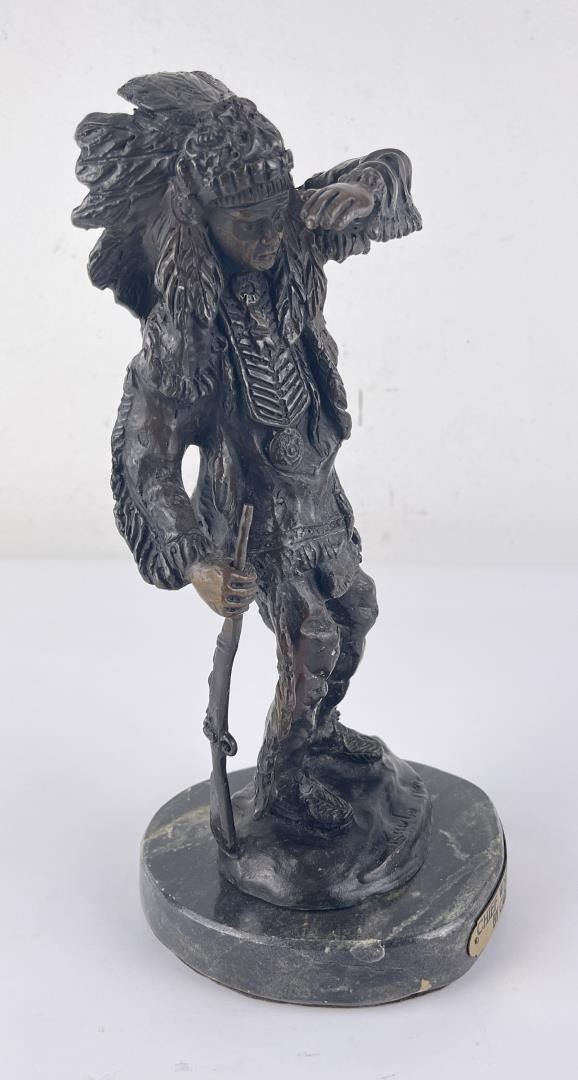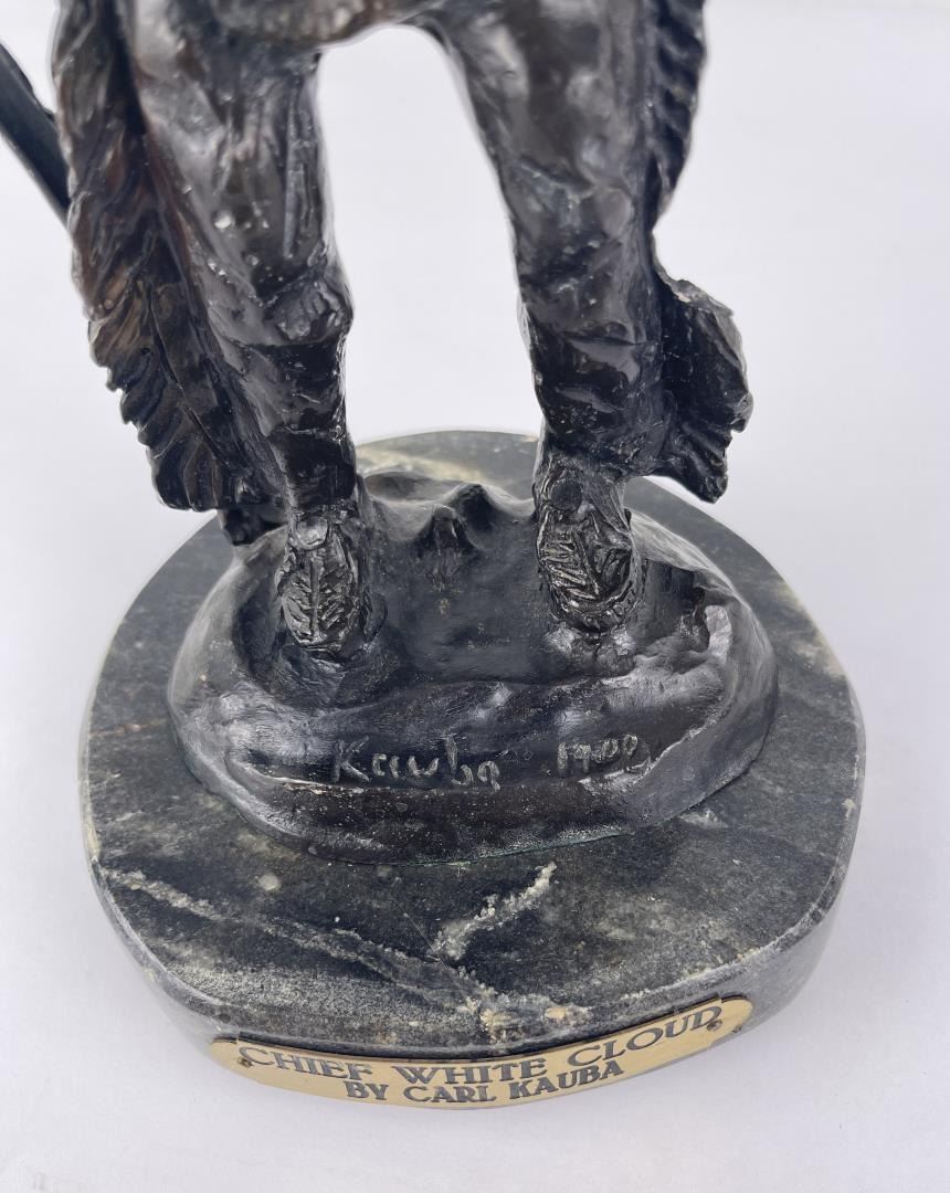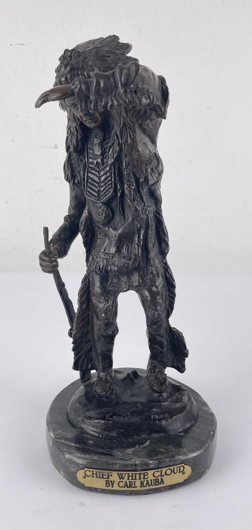 Title is Chief White Cloud. 13" tall. Carl Kauba (1865 - 1922) was active/lived in Austria, United States. Carl Kauba is known for Sculpture-western figure, Native American. Austrian sculptor of Western American bronzes specializing in Indians. Kauba was the pupil of Carl Waschmann and Stefan Schwartz in Austria. He traveled widely in the American West, sketching and modeling, about 1895. He returned to Vienna where his Western bronzes were cast for the American market between 1895 and 1912. Small and medium bronzes were sometimes polychromed at the foundry. It is said that there were two Kaubas, father and son, and that the son modeled the small polychromed bronzes.