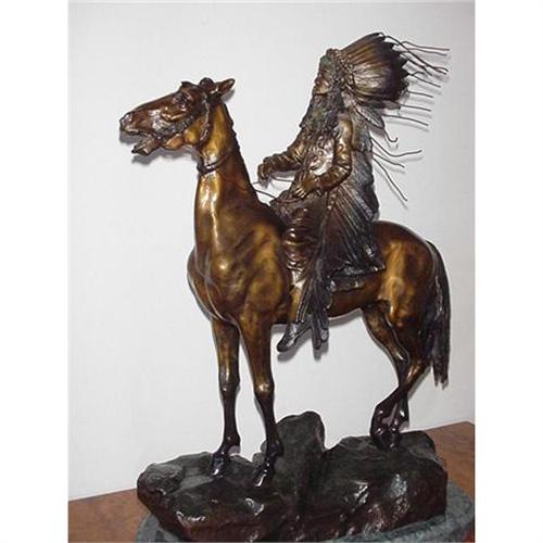 This bronze sculpture of an Indian on horseback is 23" tall, the Indian is wearing a full feather headdress and his horse is standing on a stone base, also bronze, and the entire figure is mounted on a green marble base. In the original sculpture the horse stood on a stone base. Probably made in the 1980s it is a reproduction of a famous artists work. Born in Austria in 1865 Carl Kauba was the pupil of Carl Waschmann and Stefan Schwartz in Austria. He traveled widely in the American west, sketching and modeling, about 1895. He returned to Vienna where his Western bronzes were cast for the American market between 1895 and 1912. Small and medium bronzes were sometimes polychrome at the foundry. It is said that there were two Kaubas, father and son, and that the son modeled the small polychrome bronzes. He died in 1922. ( Samuel's' encyclopedia of Artists of the American west, Peggy and Harold Samuel's, 1985, Castle Publishing.)