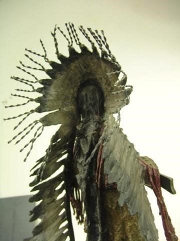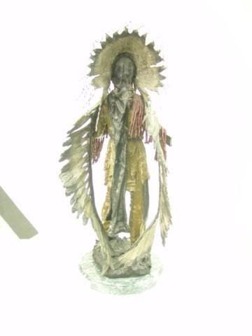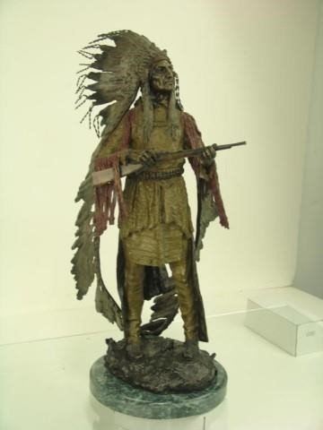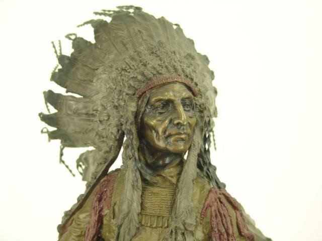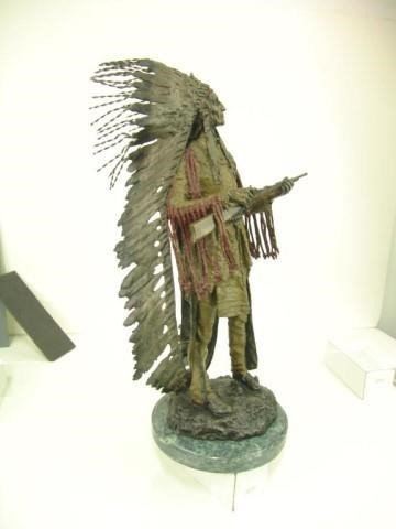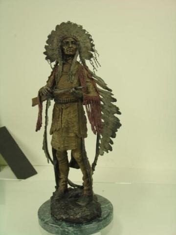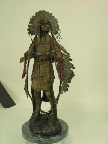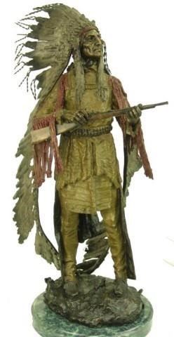 Signed, limited edition, cold patinated solid bronze sculpture, an Indian Chief in full trailing headdress holding a rifle. Very good condition.
