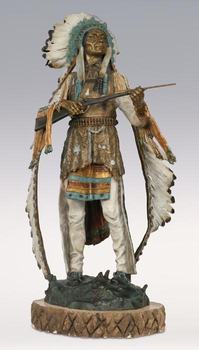 Carl Kauba (1865-1922). Indian Chief with Rifle. Bronze, 26" x 10". Colored patina. Signed. Condition Report: Fine condition.