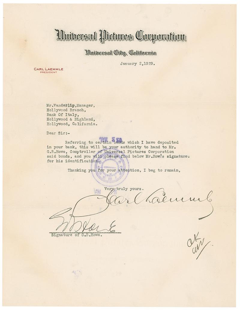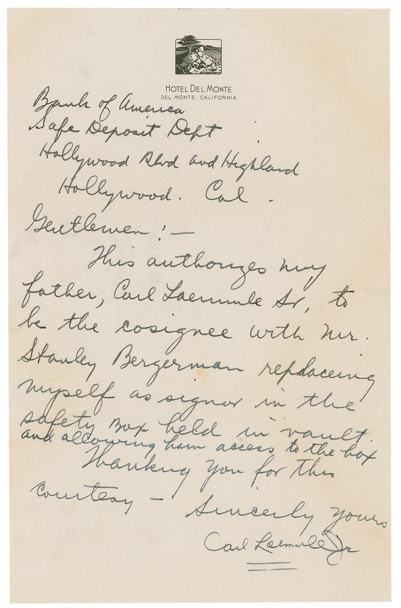 Pioneer (1867–1939) in American film making and a founder of Universal Studios. His son (1908–1979) was in charge of production at Universal Studios in the 1920s and 1930s. Two items: TLS signed “Carl Laemmle,” one page, 8.5 x 11, Universal Pictures Corporation letterhead, January 2, 1929, authorizing the studio comptroller access to bonds at the Bank of Italy in Hollywood; and an ALS signed “Carl Laemmle, Jr.,” one page, 6 x 9, Hotel Del Monte letterhead, no date. In part: “This authorizes my father, Carl Laemmle Sr., to be the cosignee…replacing myself as signor in the safety box held in vault and allowing him access to the box.” In very good to fine condition, with scattered toning and soiling, and bank stampings touching Carl Sr.’s name. Acompanied by a Bank of America envelope with Carl Jr.’s typed name.