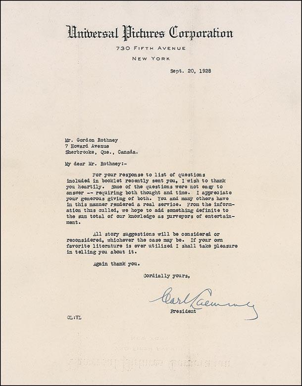 Founder (1867–1939) of Universal Studios and one of the most influential figures in the earliest years of the American film industry. TLS, one page, 8.5 x 11, Universal Pictures Corporation letterhead, September 20, 1928. Laemmle writes Gordon Rothney of Quebec. In full: “For your response to list of questions included in booklet recently sent you, I wish to thank you heartily. Some of the questions were not easy to answer—requiring both thought and time. I appreciate your generous giving of both. You and many others have in this manner rendered a real service. From the information thus culled, we hope to add something definite to the sum total of our knowledge as purveyors of entertainment. All story suggestions will be considered or reconsidered, whichever the case may be. If your own favorite literature is ever utilized I shall take pleasure in telling you about.” In fine condition, with intersecting horizontal and vertical folds with a vertical fold passing through his signature, light mirroring of letterhead, and light uniform toning.