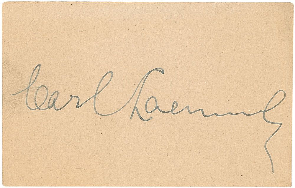 Founder (1867–1939) of Universal Studios and one of the most influential figures in the earliest years of the American film industry. Vintage ink signature, “Carl Laemmle,” on an off-white 3.25 x 2 card. In fine condition, with small area of soiling to left edge.
