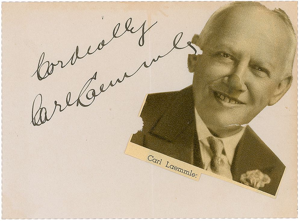 Founder (1867–1939) of Universal Studios and one of the most influential figures in the earliest years of the American film industry. Vintage fountain pen signature, “Cordially, Carl Laemmle,” on an off-white 5.5 x 4 album page with a clipped photo of Laemmle affixed to the right side. A central vertical fold passing through a single letter of signature and some mild edge toning, otherwise fine condition.
