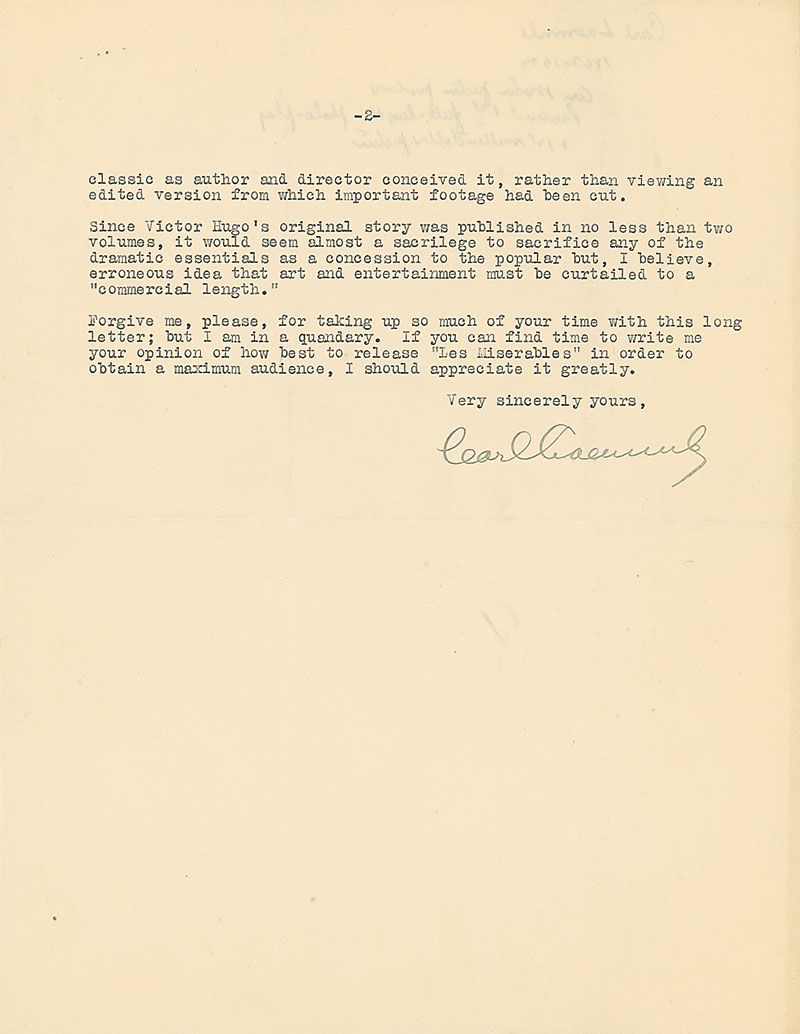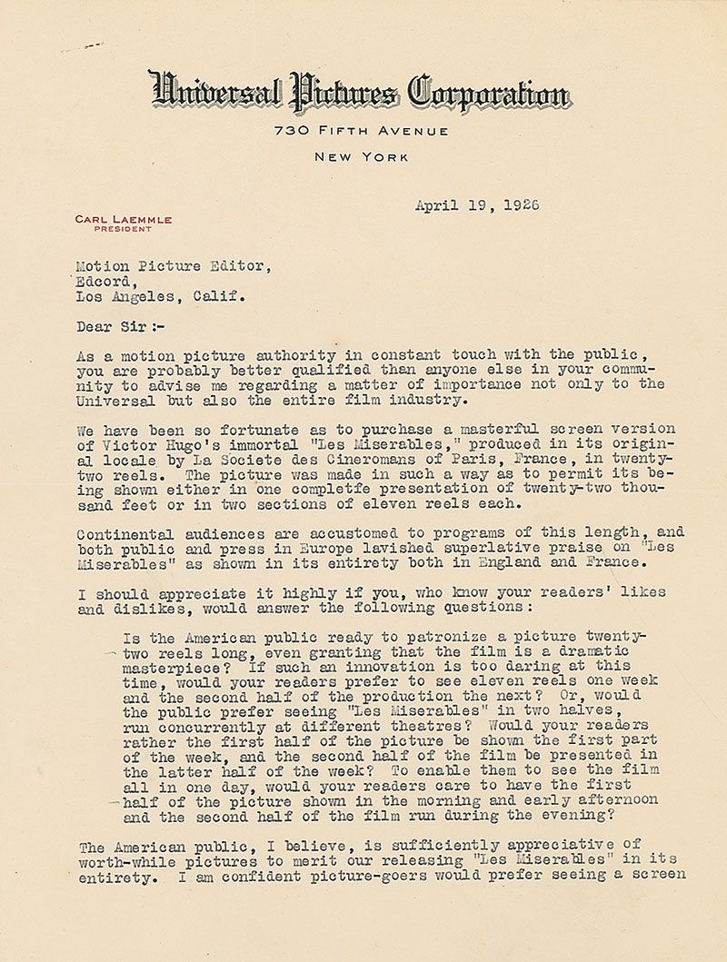 Founder (1867–1939) of Universal Studios and one of the most influential figures in the earliest years of the American film industry. TLS, two pages, 8.25 x 11, Universal Pictures Corporation letterhead, April 19, 1926. Letter to a motion picture editor, requesting advice. In part: “We have been so fortunate as to purchase a masterful screen version of Victor Hugo’s immortal ‘Les Miserables,’ produced in its original locale by La Societe des Cineromans of Paris, France, in twenty-two reels…Is the American public ready to patronize a picture twenty-two reels long, even granting that the film is a dramatic masterpiece? If such an innovation is too daring at this time, would your readers prefer to see eleven reels one week and the second half of the production the next?…I am confident picture-goers would prefer seeing a screen classic as author and director conceived it, rather than viewing an edited version…it would seem almost a sacrilege to sacrifice any of the dramatic essentials.” In fine condition, with intersecting folds (one vertical fold passing through a single letter of the signature). A thought-provoking letter from the early days of cinema, expressing the challenges of screening and marketing such epic foreign films.