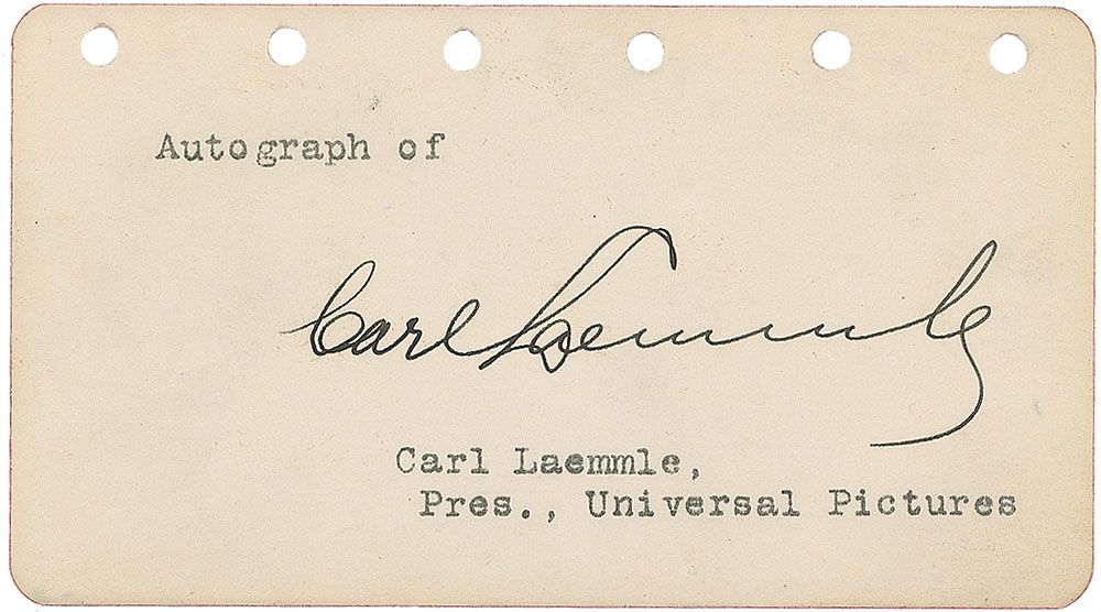Founder (1867–1939) of Universal Studios and one of the most influential figures in the earliest years of the American film industry. Vintage fountain pen signature, “Carl Laemmle,” on an off-white 4.5 x 2.5 page. In fine condition.