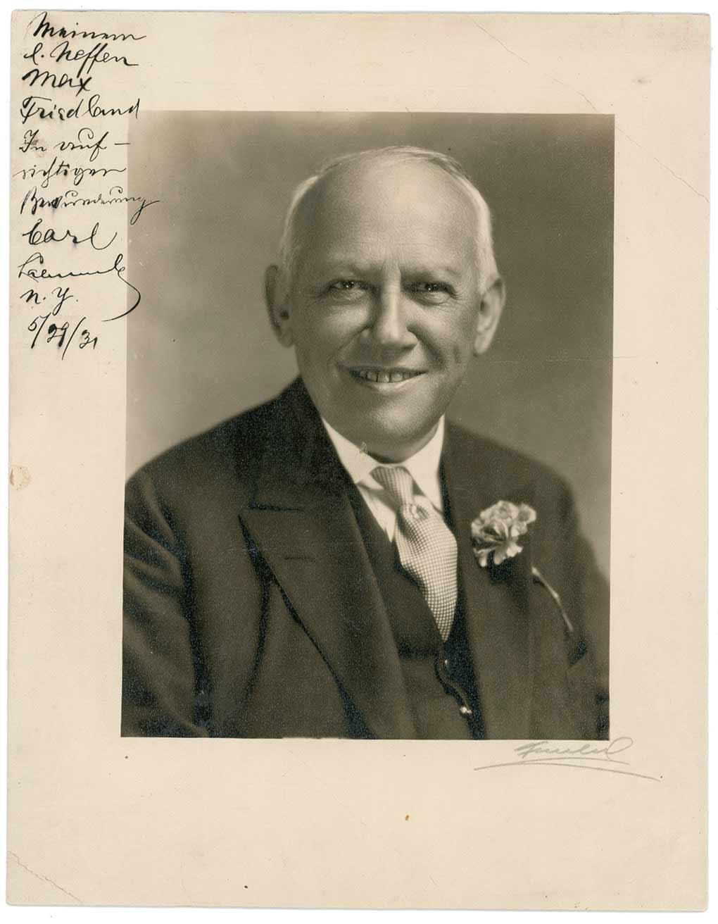 Founder of Universal Studios and one of the most influential figures in the earliest years of the American film industry. Uncommon oversize vintage matte-finish 10.5 x 13.5 photo, signed and inscribed in fountain pen in German and dated May 29, 1931. Photo is also signed in pencil under the image by the photographer. In very good condition, with a few light brushes to signature and inscription, several noticeable creases to image and borders, and some scattered light silvering to darker areas of image.