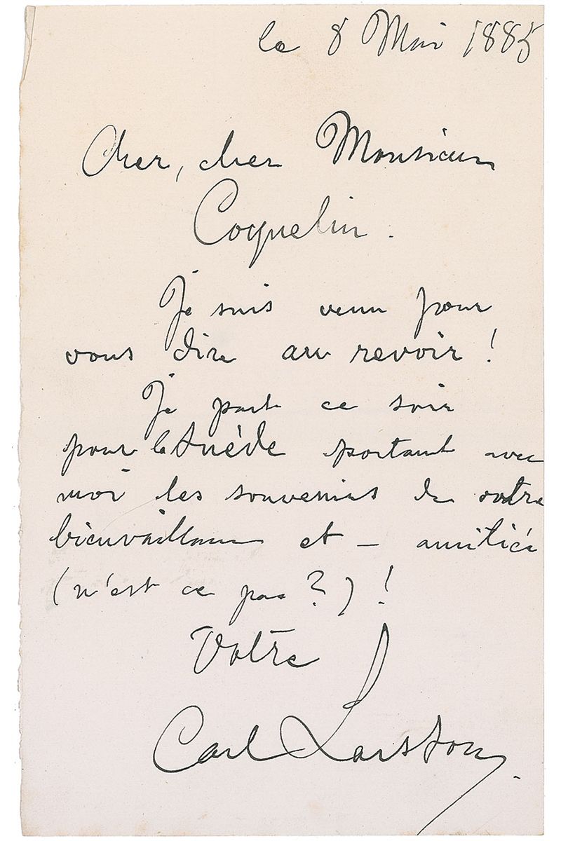 Popular Swedish painter and illustrator (1853–1919). ALS in French, one page, 4.25 x 7, May 8, 1885. Letter to the great French actor Coquelin, translated in part: “I leave tonight for Sweden carrying with me the gratitude for your protection and, also, your friendship (isn’t it?).” In fine condition.