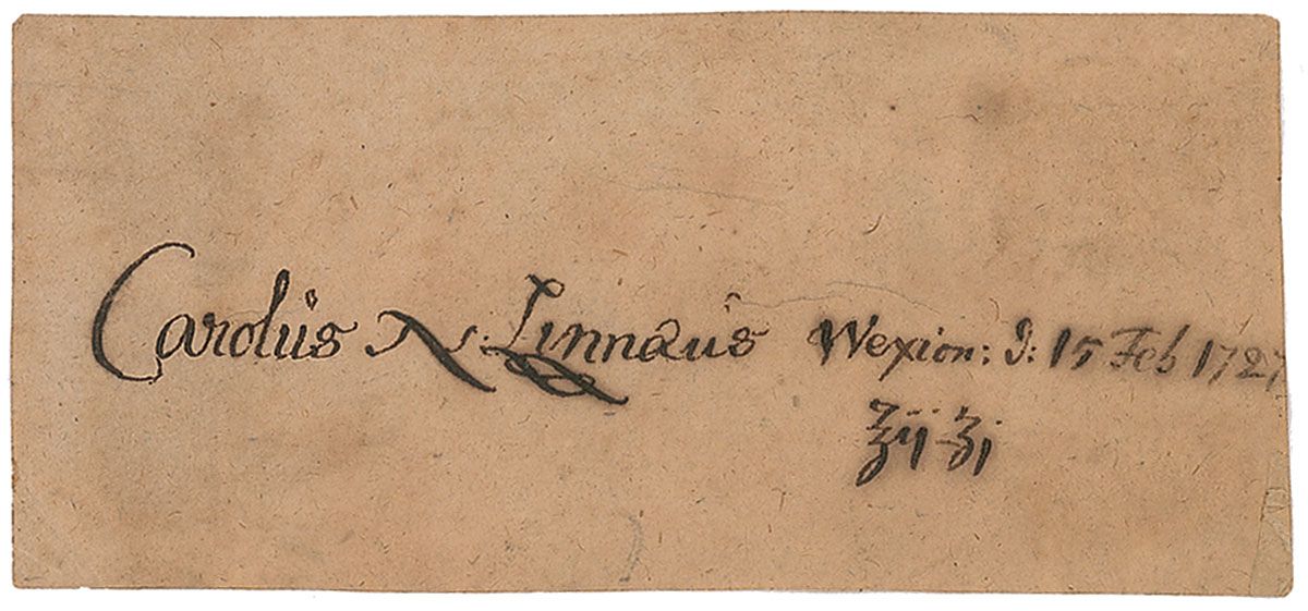Swedish botanist, physician, and zoologist (1707–1778), who laid the foundations for the modern scheme of binomial nomenclature. Uncommon full ink signature, “Carolus N. Linnaeus, Wexion: I: 15 Feb 1727,” on an off-white 4 x 2 slip. Mild overall toning, with a few heavier spots, and some mild haloing around date, otherwise fine condition.