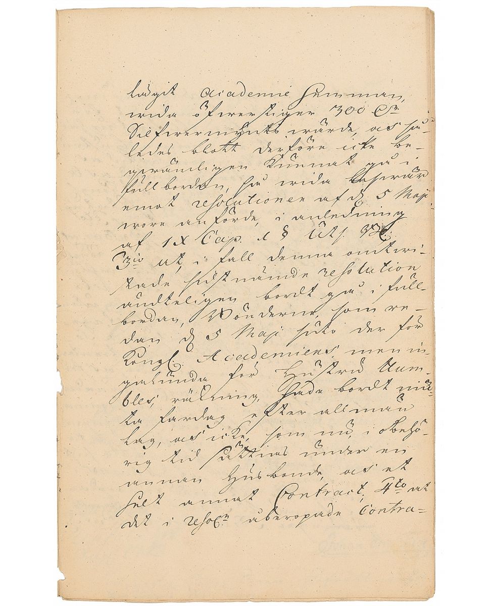 Exceptional LS in Swedish, nine pages on five sheets, 8 x 12.75, August 19, 1743. Untranslated letter written on behalf of the “Consistorium Academicum” at the University of Uppsala, in the matter of the estate of Gryttiom. Signed at the conclusion by Linnaeus and 10 other scientists, including: Mattsius Asp, Magnus Beronius, Anders Boberg, Olof Celsius, Petrus Kerman, Samuel Klingenstierna, Daniel Solander, Petrus Ullen, and Johan Eric Fick. In fine condition, with a single horizontal and vertical fold. Linnaeus (1707–1778) is remembered as the remarkably influential botanist and zoologist who developed a system of classification for categorization of organisms and binomial nomenclature for naming them—he is universally recognized as the ‘father of taxonomy.’ While he is the most well-known of the signers here, several others made contributions to the advancement of modern science as well—Celsius was a mentor of Linneaus and the nephew of Anders Celsius, developer of the eponymous temperature scale; Klingenstierna was the first to recognize errors in Isaac Newton’s theories of refraction; and Solander was the first university-educated scientist to set foot on Australian soil after accompanying James Cook on his first voyage on the Endeavour.