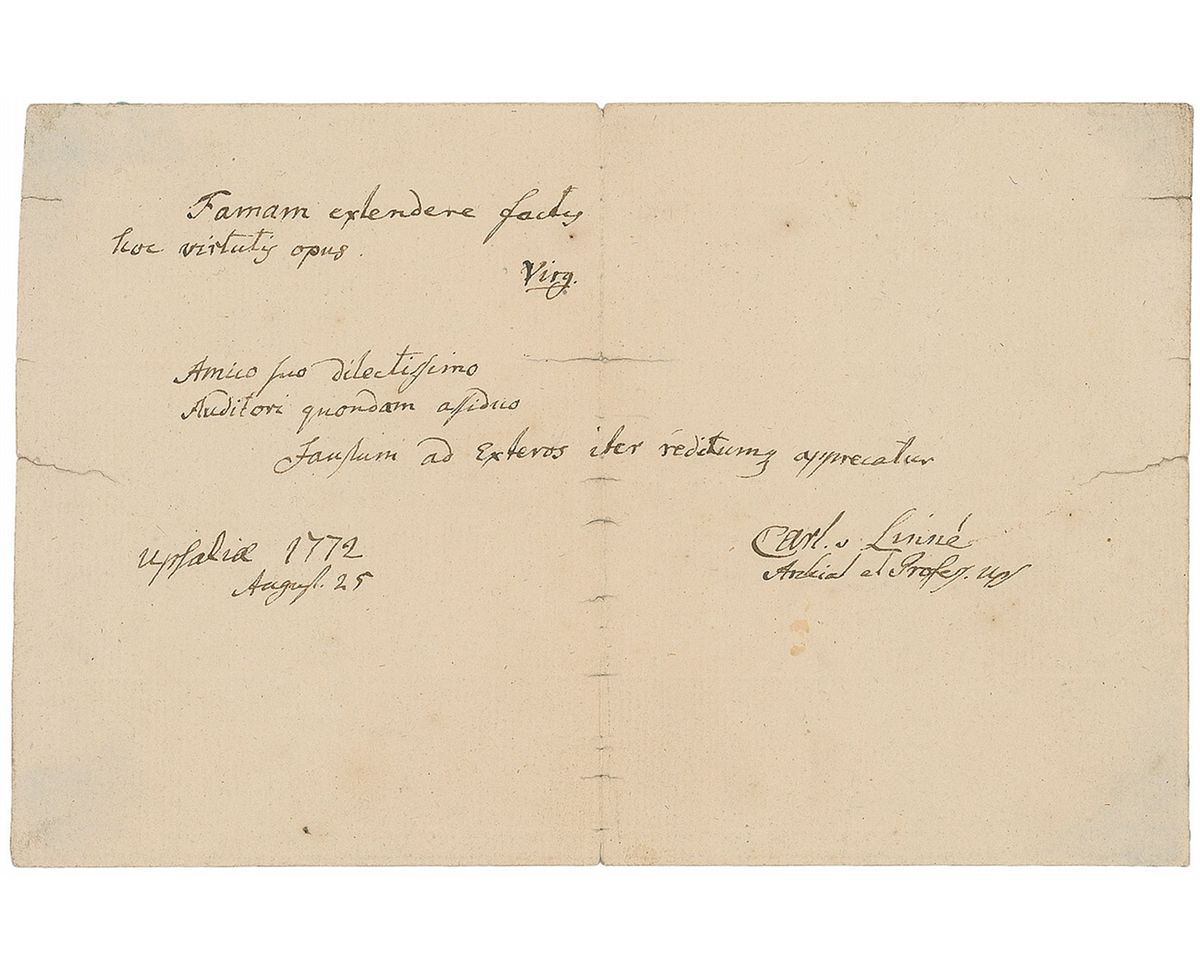 Swedish botanist, physician, and zoologist (1707–1778), who laid the foundations for the modern scheme of binomial nomenclature. Rare AQS in Latin on an off-white 7.5 x 5 sheet, signed at the conclusion, “Carl. v. Linne, Archiat. et Profess. Ups.,” and dated at Uppsala, August 25, 1772. Linnaeus pens a quote from Virgil’s Aeneid, in full: “Famam extendere factis hoc virtutis opus [It is the work of virtue to extend our fame by our deeds].” A central vertical fold, scattered creases, and a few edge tears, otherwise fine condition. Accompanied by an engraved portrait. Nearing the end of his career as a scientist and professor, Linnaeus was ennobled by Swedish King Adolf Frederick in 1761, after which he took on the name “Carl von Linne,” as he signs here, with ‘Linne' being a shortened and gallicised version of ‘Linnaeus,’ and the German title 'von' signifying his ennoblement. As a nobleman his family was given a coat of arms, which symbolizes his scientific achievements in its design and features a portion of this phrase at the bottom, ‘Famam extendere factus [We extend our fame by our deeds].’ An exceedingly desirable autograph from this tremendously influential scientist, incorporating his heraldic motto borrowed from one of the classical world’s most epic tales.