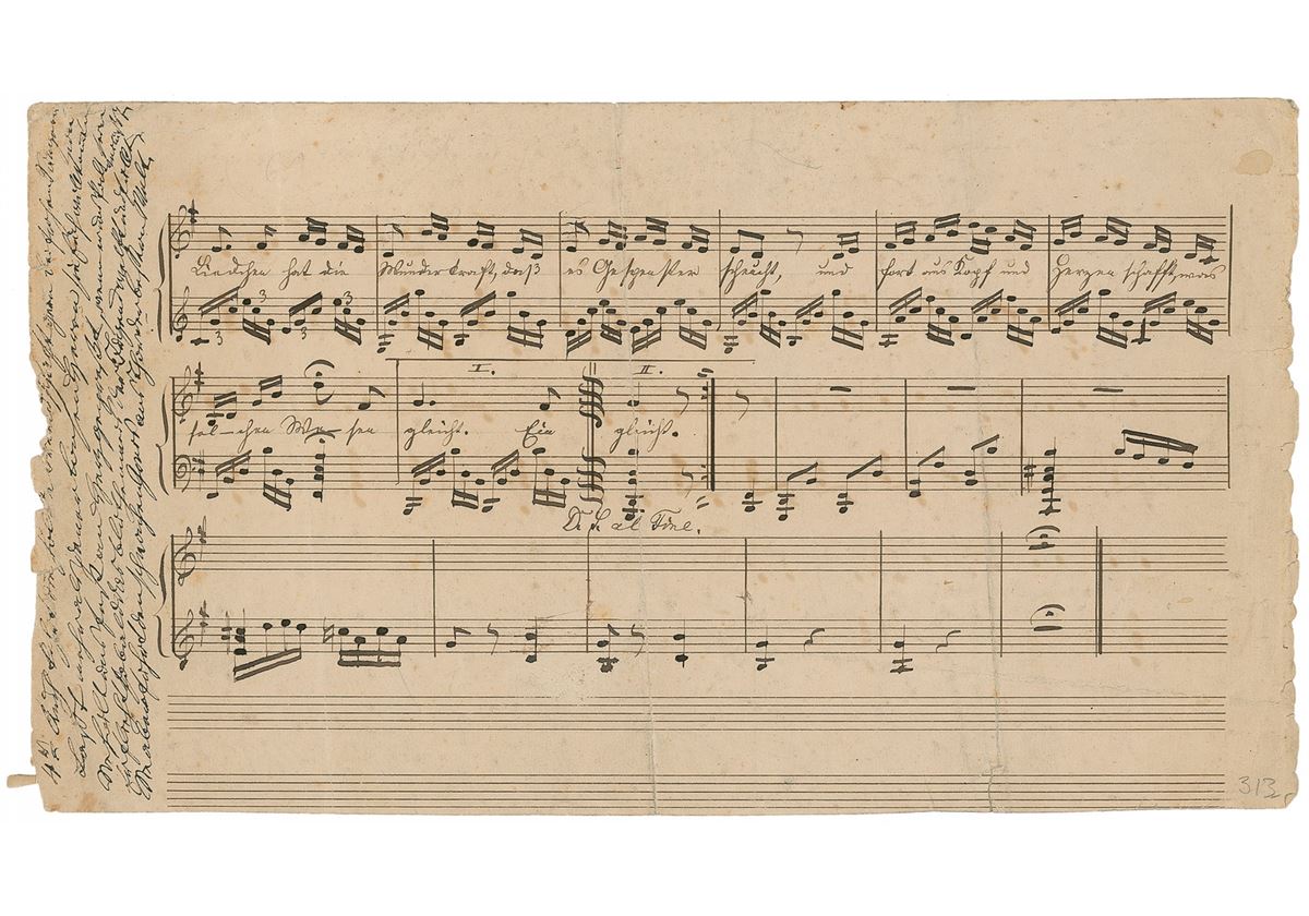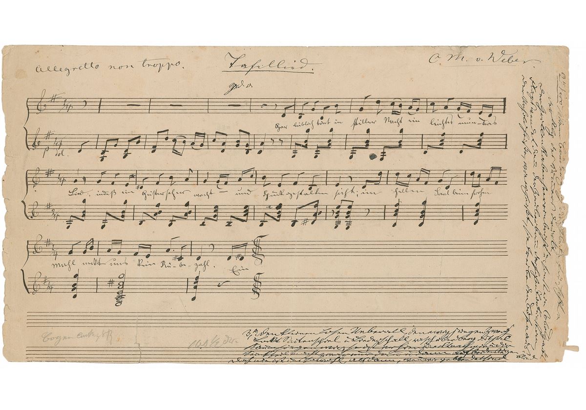 German composer, conductor, pianist, guitarist, and critic, one of the first significant composers of the Romantic school (1786–1826). Autograph musical manuscript, signed at the top, “C. M. v. Weber,” one page both sides, 13.25 x 7.5, no date. Weber pens thirty-six bars of “Tafellied,” writing the text of the first verse of A. F. E. Langbein's ‘Der Zauberbaum [The Magic Tree]’ under the staves. The second, third, and fourth verses are penned in the margins. In very good condition, with a few vertical folds (one vertical fold passing through a single letter of the signature), several chips and tears to edges (affecting some of the writing), and some scattered soiling. Accompanied by a letter from the head of the music department of the Berlin State Library confirming authenticity.