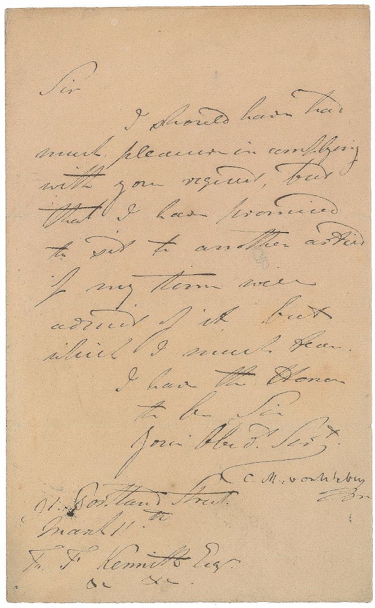 Weber had been commissioned to write an opera based on C. M. Wieland’s epic poem Oberon and had just arrived in London on March 6 to complete it and begin rehearsals with The Royal Opera. He stayed at the home of Sir George Smart, his close friend and an accomplished musician in his own right. Although suffering from tuberculosis, Weber was able to push through rehearsals and conduct the premiere of Oberon one month after writing this letter. He conducted twelve performances of it before passing away at Smart’s house on June 5. As Weber could not speak English and had to dictate this letter to Smart, similar examples are exceedingly rare.
