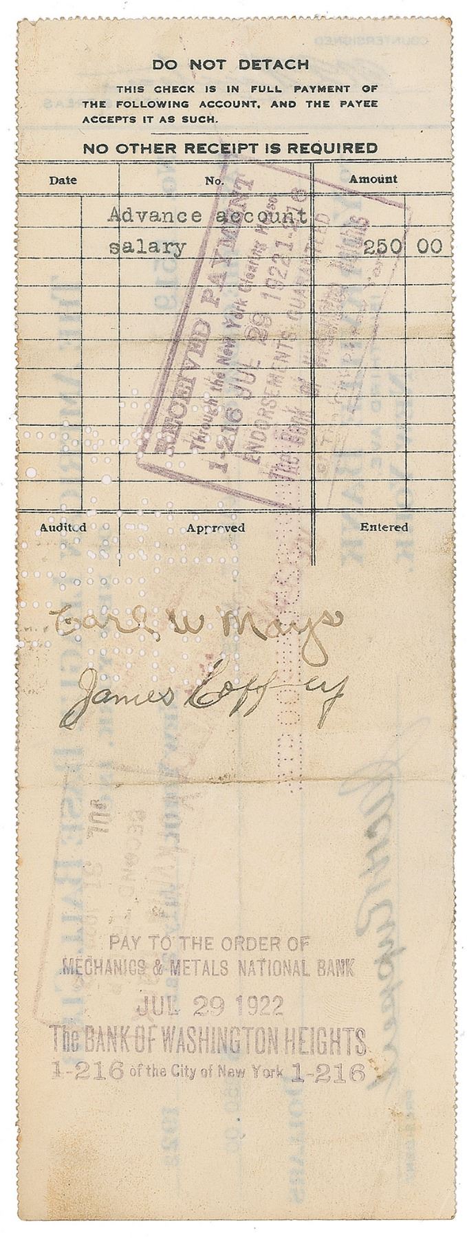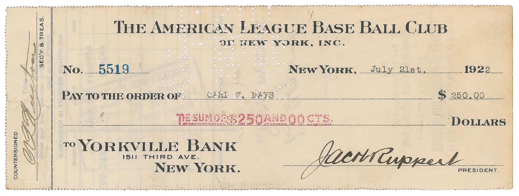 The American League Base Ball Club of New York check, 9 x 3.25, filled out in type and signed by Ruppert, "Jacob Ruppert," and vertically countersigned by Huston, "T. L. Huston," payable to Carl W. Mays for $250, July 21, 1922. Endorsed on the reverse in black ink, "Carl W. Mays." In fine condition. A desirable thrice-signed check featuring the two Yankees co-owners and a three-time World Series champ, a pitcher more notoriously remembered for causing the first and only on-field death in MLB history when he accidentally struck Indian Ray Chapman with a high fastball.