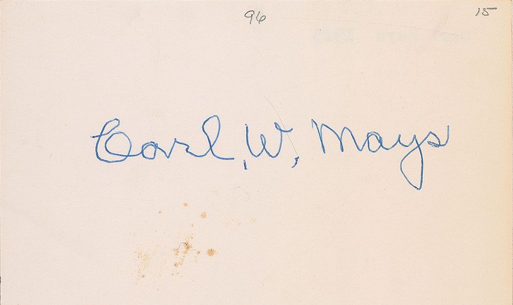 American League pitcher, unfortunately remembered for one tragic, misguided pitch that struck Cleveland shortstop Ray Chapman in the head. Chapman collapsed at home plate and died the next day at a New York hospital without ever regaining consciousness. Ballpoint signature, “Carl W. Mays,” on an off-white 5 x 3 card with a couple light pencil notations to top. In fine condition, with some light foxing under signature.
