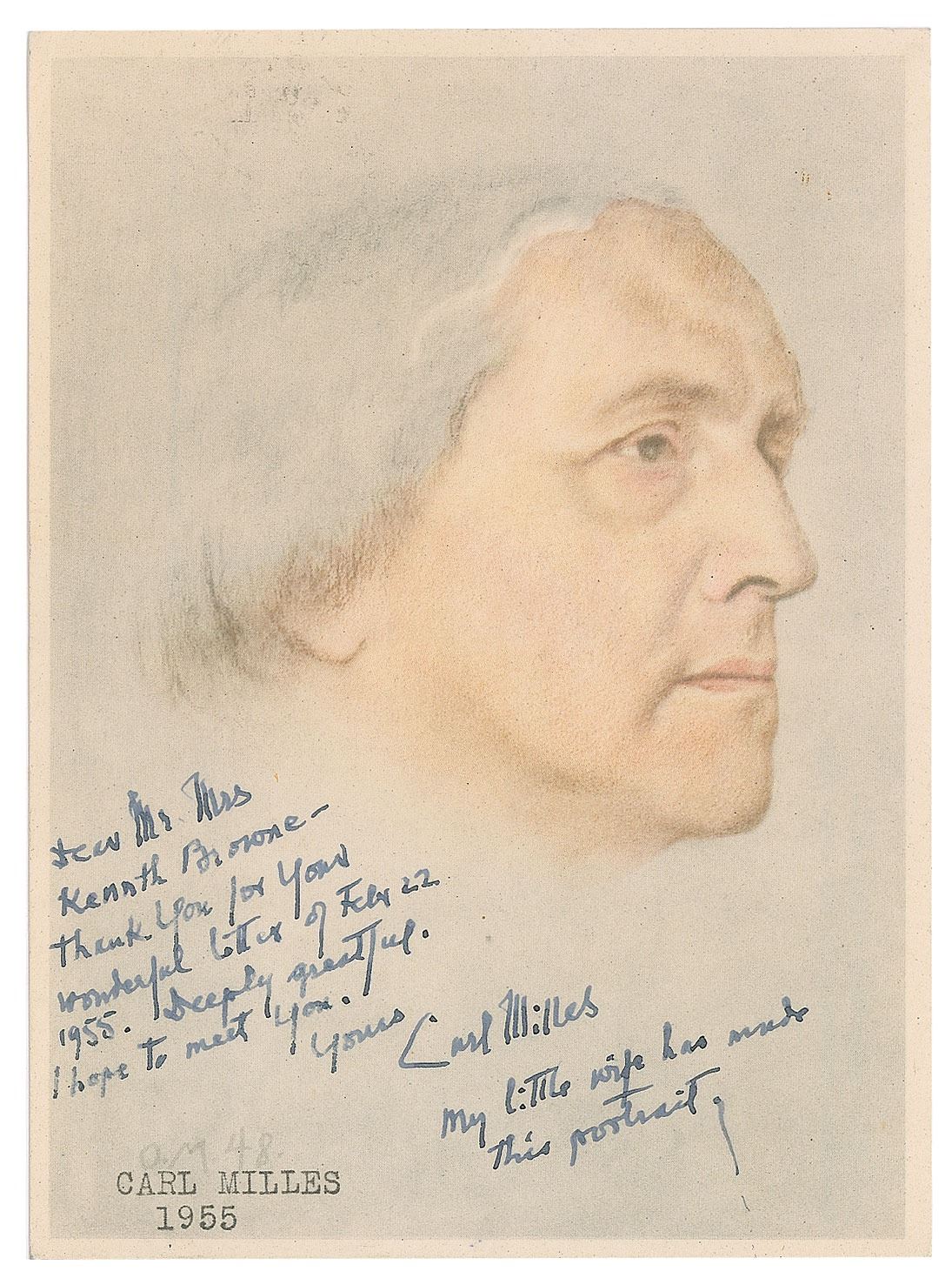 Color 4.25 x 6 postcard photo showing an artistic portrait of Carl Milles by his wife and fellow artist Ola Milles, signed and inscribed in fountain pen, "For Mr. & Mrs. Kenneth Browne—Thank you for your wonderful letters of Febr. 22, 1955. Deeply grateful. I hope to meet you. Yours, Carl Milles, My little wife has made this portrait.” In fine condition.