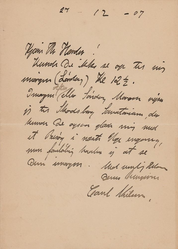 ALS in Danish, one page, 5 x 7, December 27, 1907. Untranslated handwritten letter, boldly penned by Nielsen during his tenure as second conductor at the Royal Theatre. In fine condition.