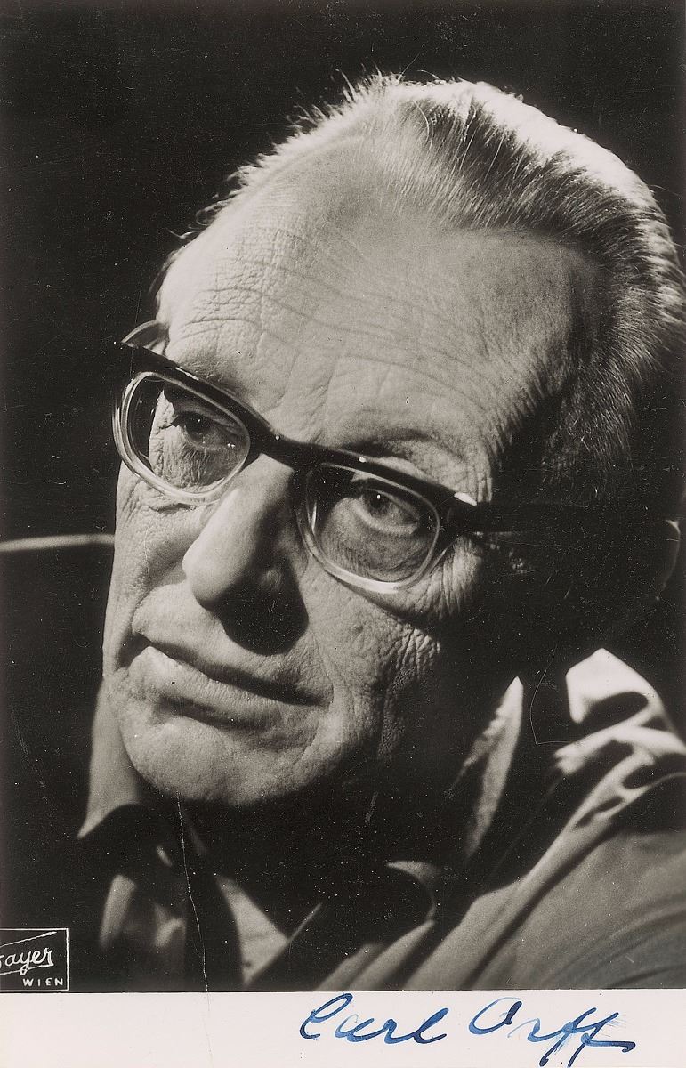 German composer (1895–1982) best known for his oratorio ‘Carmina Burana.’ Semi-glossy 3.5 x 5.5 postcard photo of Orff by Fayer of Wien, signed in the lower border in fountain pen. A crease to the lower right extending from the bottom edge to his chin and light brushing to ink, otherwise fine condition.