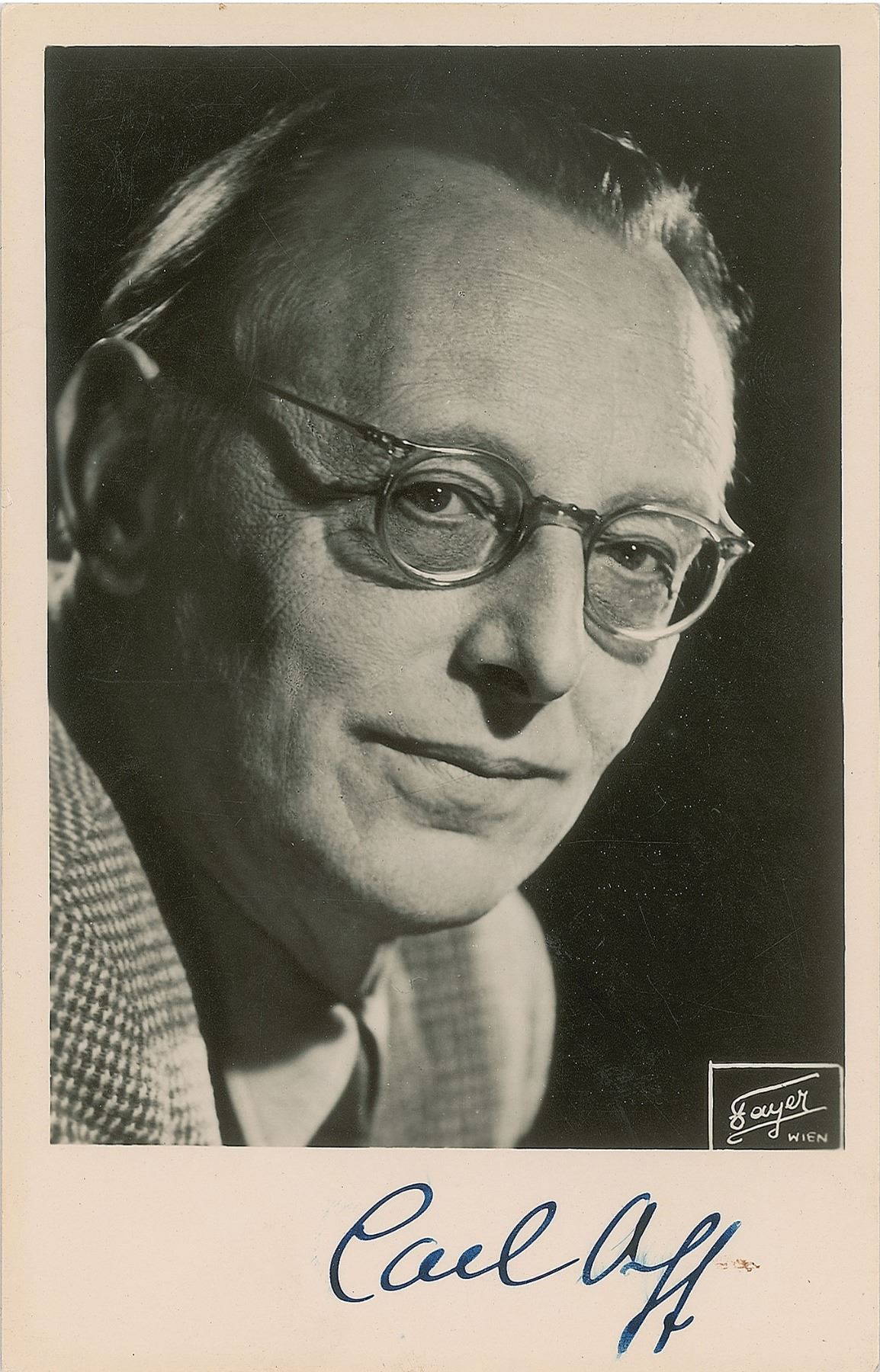 German composer (1895-1982) best known for his oratorio 'Carmina Burana.' Vintage matte-finish 3.5 x 5.5 postcard photo of Carl Orff by Fayer & Co. of Vienna, signed boldly in the lower border in fountain pen. In fine to very fine condition.