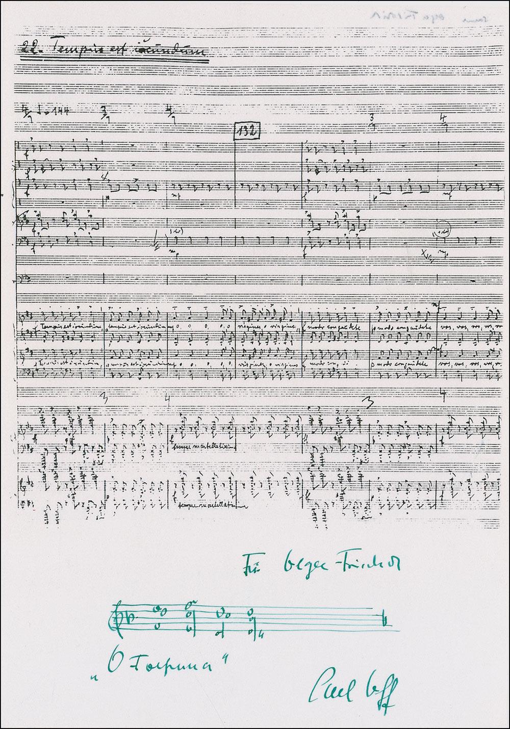 German composer (1895-1982) best known for his oratorio Carmina Burana. AMQS at the bottom of a photocopied 8.5 x 11.5 musical manuscript page. At the bottom, Orff pens two bars from O Fortuna, part of Carmina Burana, in green ink, signing underneath, and adding a brief inscription above the quote. In fine condition. RRAuction COA.