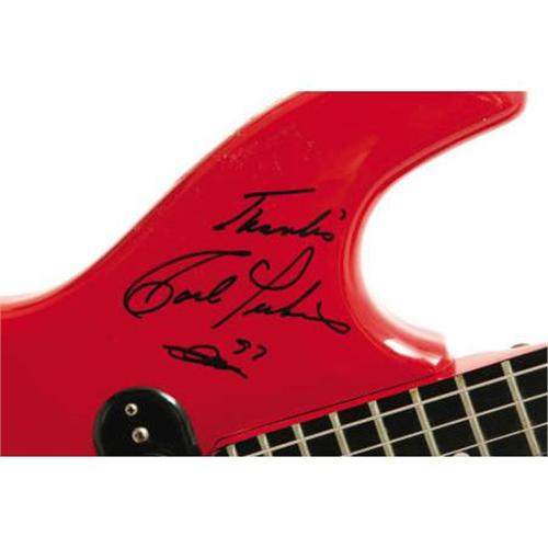 <B>Carl Perkins Autographed Guitar.</B></I> A red six-string electric guitar of unknown manufacture, inscribed and signed by the Rockabilly pioneer in black marker. In Excellent condition. <I>Accompanied by LOA from PSA/DNA.</B></I> <I>Accompanied by LOA from PSA/DNA.</B></I><BR><BR><b>Shipping:</b> Musical Instruments, Large (<a target="_blank" href="http://www.heritageauctions.com/common/shipping.php">view shipping information</a>)