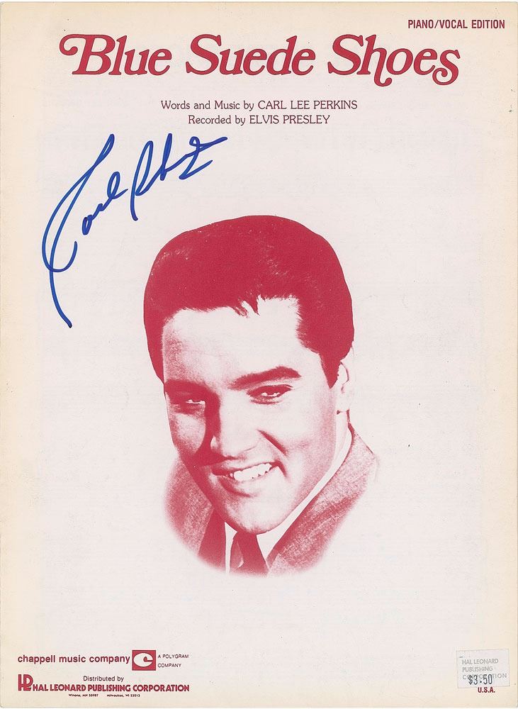 Chappell Music Company sheet music for the song 'Blue Suede Shoes' by Elvis Presley, four pages, 9 x 12, signed on the front in blue felt tip by Carl Perkins. In fine condition. Originally obtained by in-person specialist Mike Wehrmann.