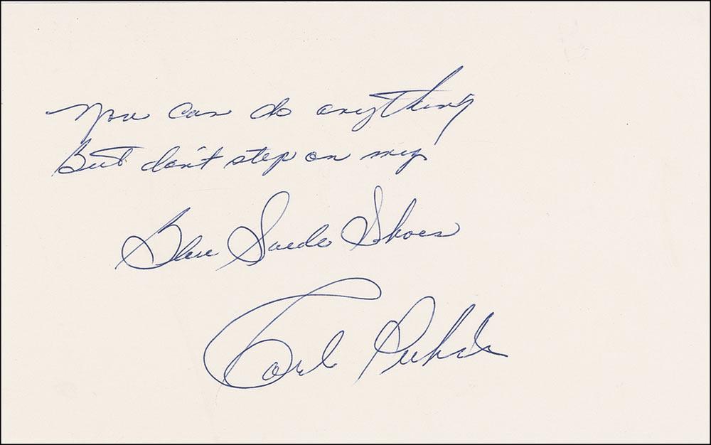 AQS on an off-white 8 x 5 card. Perkins writes “You can do anything, But don’t step on my Blue Suede Shoes,” and signed at the conclusion “Carl Perkins.” In very fine condition.