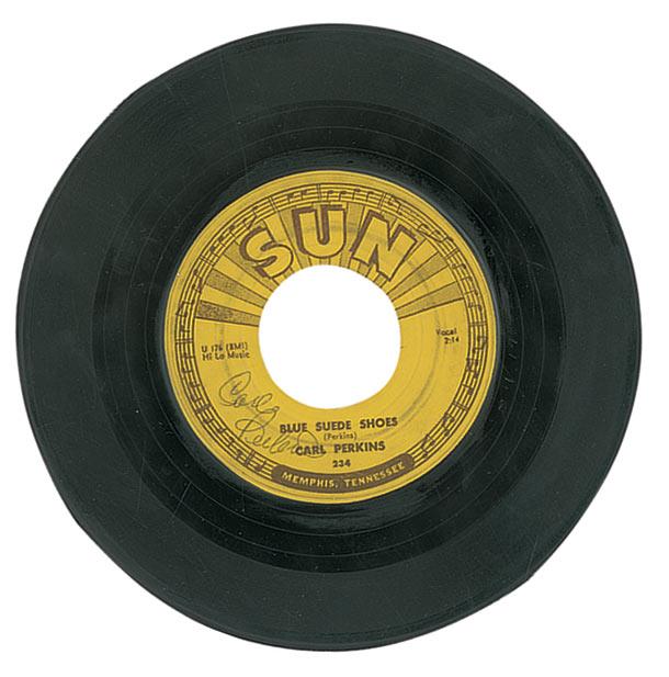 Original Sun Records 45 rpm record for ‘Blue Suede Shoes/Honey Don’t,’ signed on the label in ballpoint by Perkins. In fine condition, with a felt tip notation on the ‘B’ side label.