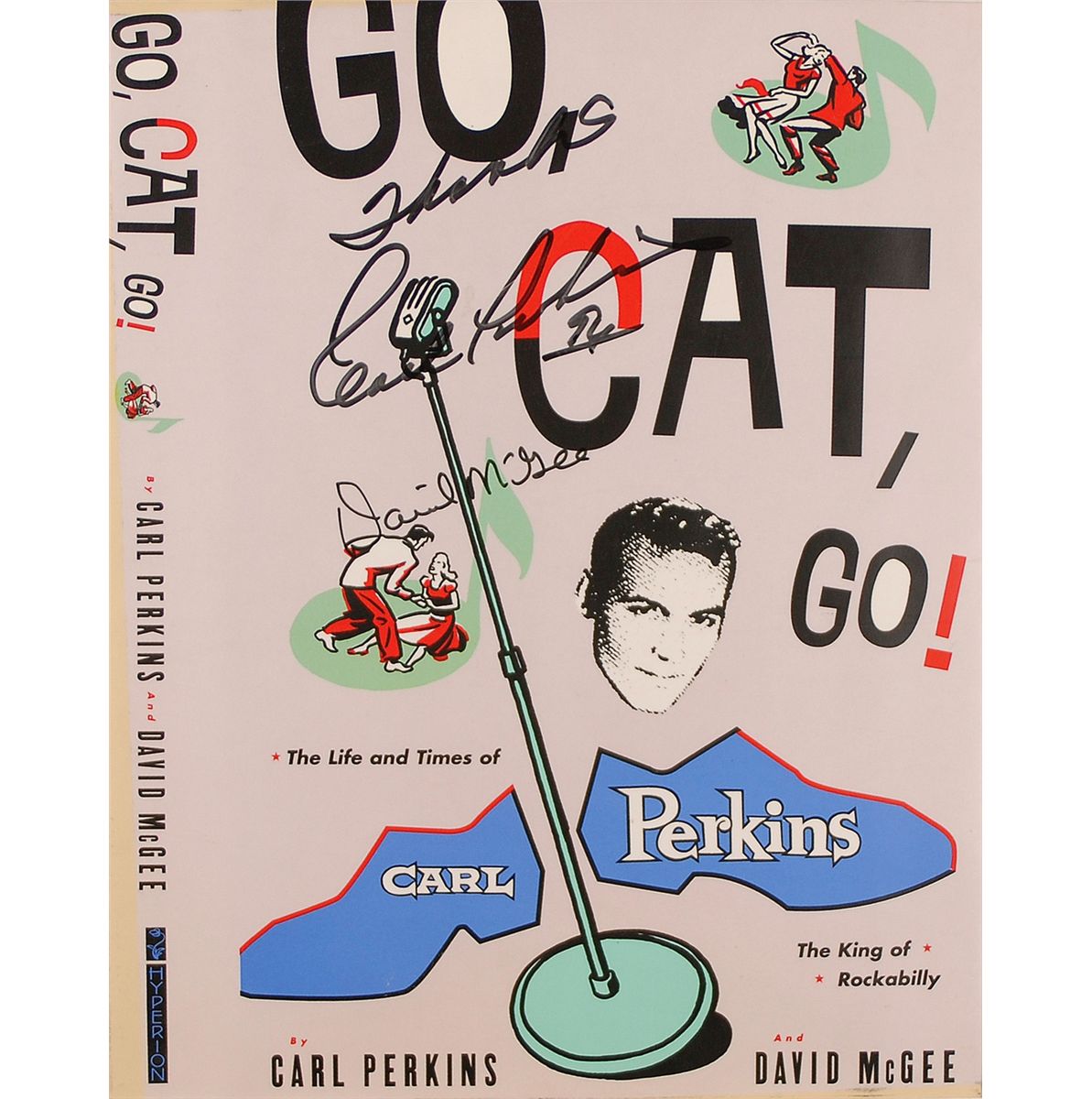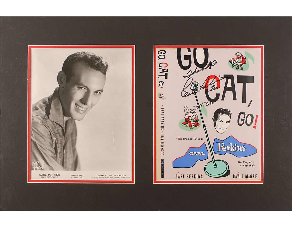 Dustjacket front to Perkins’ book Go, Cat, Go, 7.25 x 9.25, signed in black felt tip, “Thanks, Carl Perkins 96,” and also signed by co-author David McGee. Double matted with a glossy 8 x 10 of a young Perkins to an overall size of 21 x 14. In fine condition, with light toning along edges of dustjacket.