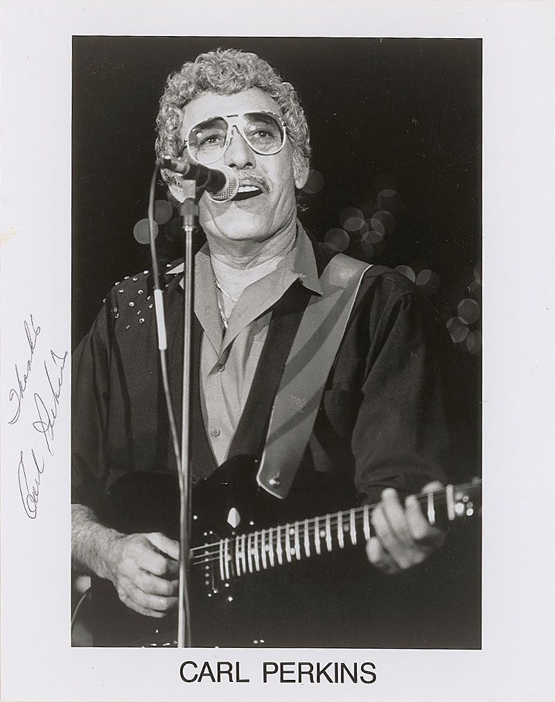 Glossy 8 x 10 photo of Perkins on stage, signed in the left border in black ballpoint, “Thanks, Carl Perkins.” In fine condition, with a few scattered light creases.