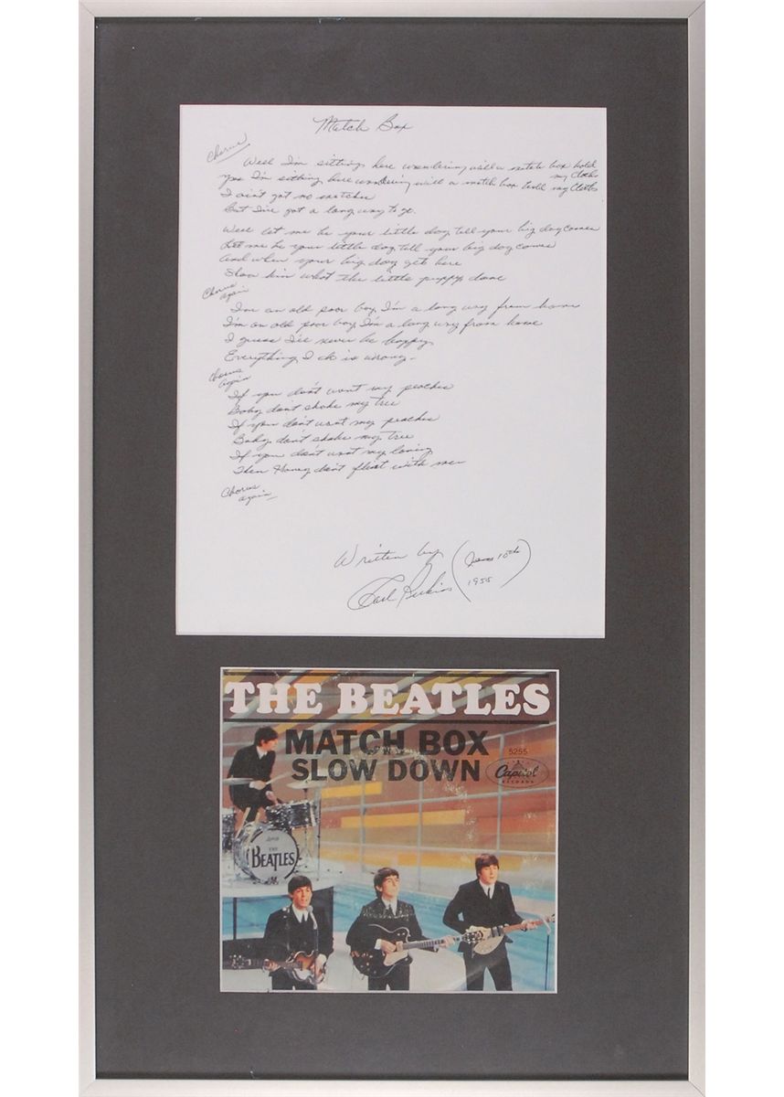 Souvenir handwritten lyrics to ‘Match Box,’ on an off-white 8.75 x 11 sheet. Perkins writes out all three verses and the chorus to the song, signing at the bottom, “Written by Carl Perkins (Jan 10th 1955).” Matted and framed with a 45 rpm sleeve of the Beatles’ release of the song to an overall size of 13 x 22.5. In fine condition.