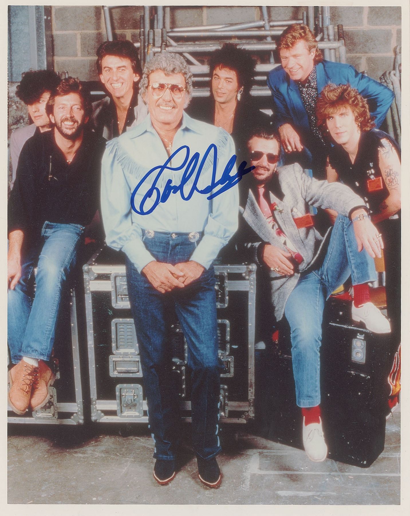 Color glossy 8 x 10 photo of Carl Perkins posing with a number of music legends including George Harrison, Ringo Starr, and Eric Clapton, signed in blue felt tip by Perkins. In fine condition. Originally obtained by in-person specialist Mike Wehrmann.