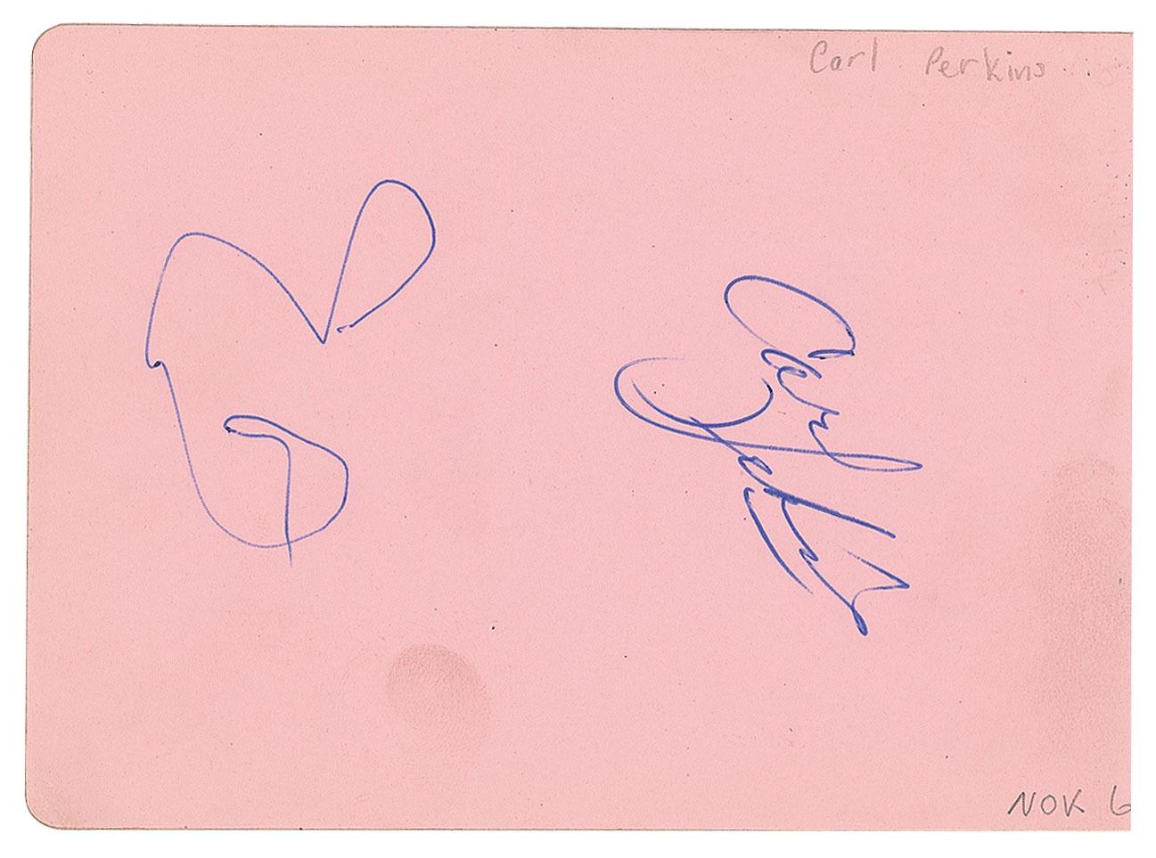 Vintage ballpoint signature, "Carl Perkins,” on a light pink 5 x 3.75 album page. Consignor notes that the autograph dates to the 1960s. In fine condition, with some light soiling. Accompanied by a certificate of authenticity from Tracks.