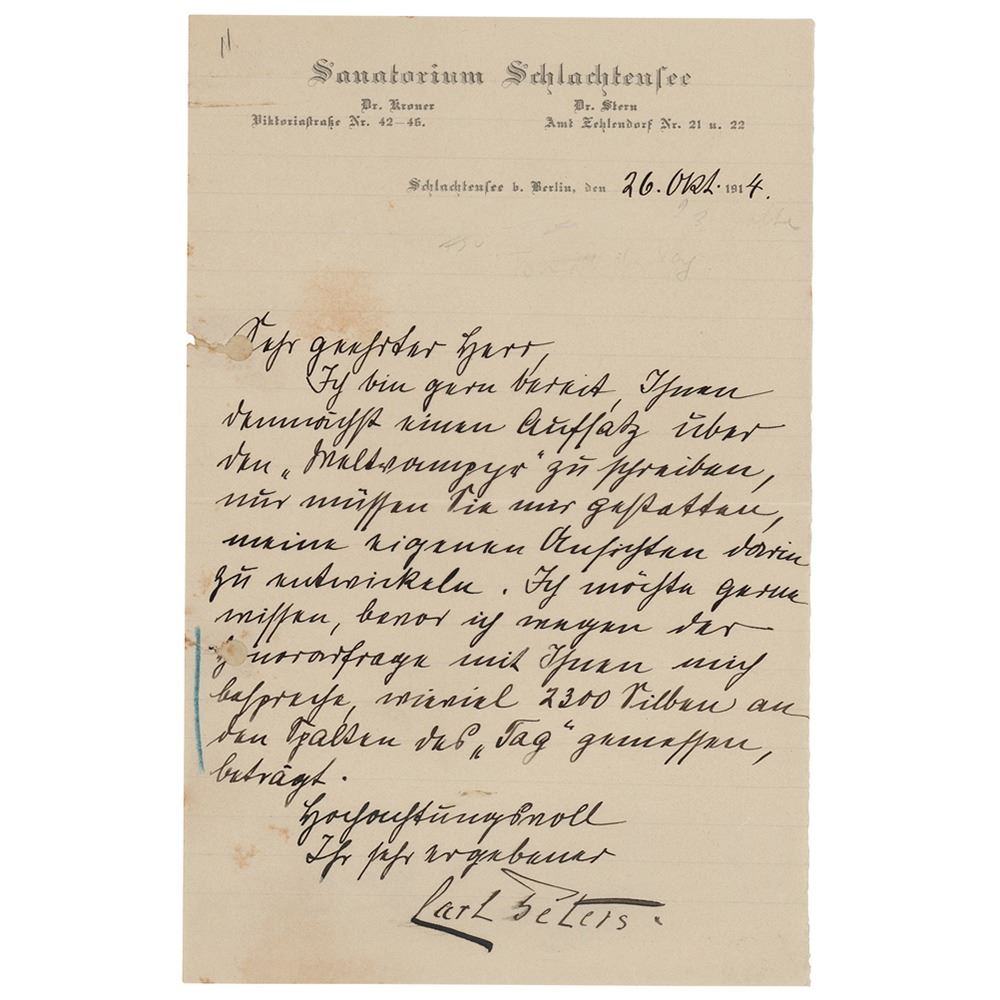 ALS in German, one page, 5.75 x 8.75, Sanatorium Schlachtensee letterhead, October 26, 1914. Untranslated handwritten letter by Peters. In very good to fine condition, with small repairs to two torn filing holes on the left edge.