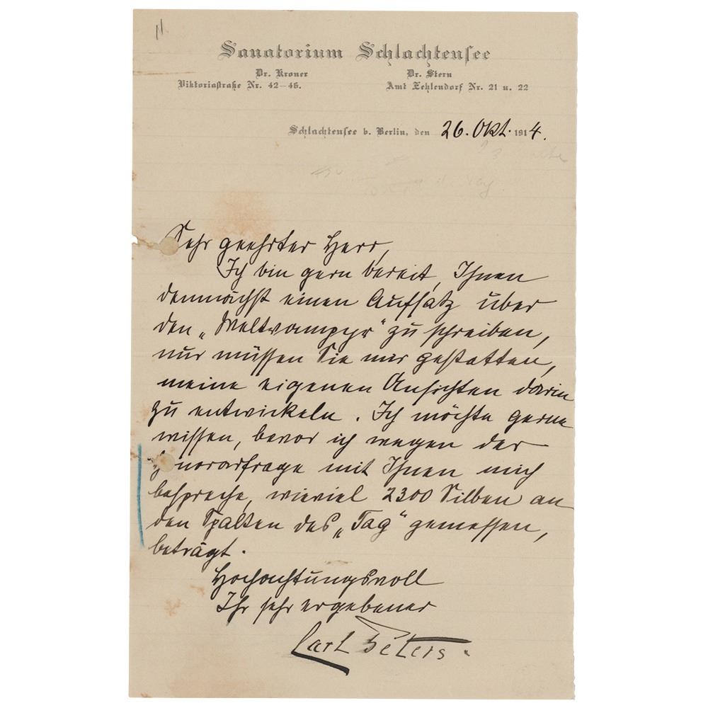 German colonial ruler, explorer, politician, and author (1856–1918) who was a major promoter of the establishment of German East Africa; his brutality toward the local population made him one of the most controversial colonizers in modern history. ALS in German, one page, 5.75 x 8.75, Sanatorium Schlachtensee letterhead, October 26, 1914. Untranslated handwritten letter by Peters. In very good to fine condition, with small repairs to two torn filing holes on the left edge.