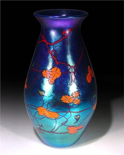 Carl Radke (Phoenix Studios) 2004 Tiffany style vessel with orange flowers over iridescent blue background. Signed and dated. Height 10". Donated by: Phoenix Studios.<p>Proceeds from the auction will go to benefit Santa Cruz, California glass artist Steven Lundberg, who, after 30 years of blowing glass locally, was diagnosed with amyotrophic lateral sclerosis, or ALS (Lou Gehrig's disease). This auction is a fundraising effort to help Steve meet the challenges of this disease.<p>Costs of treating ALS over a period of time can be exorbitant. In the short-term, Steve needs basic equipment such as an electric scooter and pointing devices to help him read and write.<p>Please join us for this auction, and help support a friend. Check out our other auctions to see the 150 paperweights, vessels, and glass sculptures from internationally known glass artists, donated by generous artists, galleries, and glass collectors from all over the country. Please contact us at 1-800-538-0766 or (831) 427-1177 for more information, or see <a href=http://www.selman.com/press target=_blank>www.selman.com/press</a>.