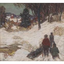 Carl Rudolph Krafft (American, 1884-1938), “Winter Sledding”, c. 1920; oil/canvas, 18” x 20”, signed; label from Grable’s Art Shop, Oak Park verso, original frame. Krafft studied at the Art Institute of Chicago and the Chicago Fine Arts Academy. He was a prolific painter and was active in numerous art organizations, including the Chicago Galleries Association, Cliff Dwellers, Oak Park Art League, Painters and Sculptors of Chicago, and the Society of Ozark Painters. He exhibited from the 1910s-30s, primarily landscape paintings which sometimes included figures. He exhibited at the National Academy of Design, Pennsylvania Academy of Fine Art, Art Institute of Chicago (1915-1925), and the Corcoran Museum (Washington D.C.). His work is included in numerous important public collections, including the University of Illinois, Richmond, Indiana Art Association, Nineteenth Century Women’s Club, Los Angeles Museum, Municipal Art league (Chicago), and South Shore Country Club. Krafft maintained a studio in Oak Park, Illinois, but he also traveled to Brown County, Indiana, and the Missouri Ozarks. This is a very desirable subject for this artist.