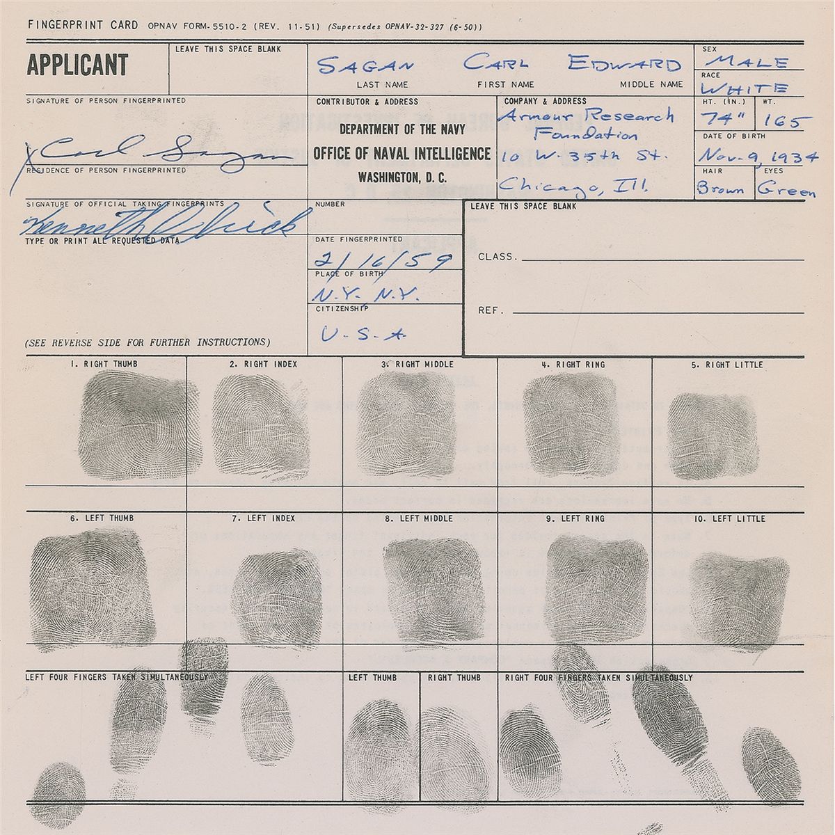 Also present are four documents signed by Sagan from 1959, including: an Office of Naval Intelligence fingerprint card, bearing original ink fingerprints of each individual finger as well as all ten simultaneously; a personnel security questionnaire, again filled out at length and signed by Sagan; and a security termination statement from the end of his employment in the summer of 1959, with an attached temporary identification card signed on the reverse. An insurance-related card is also included, signed by Sagan in print. Accompanied by several other personnel documents, not signed by Sagan. Several of these documents are signed by Dr. Leonard Reiffel, who oversaw Project A119. In overall fine condition, with expected document wear.