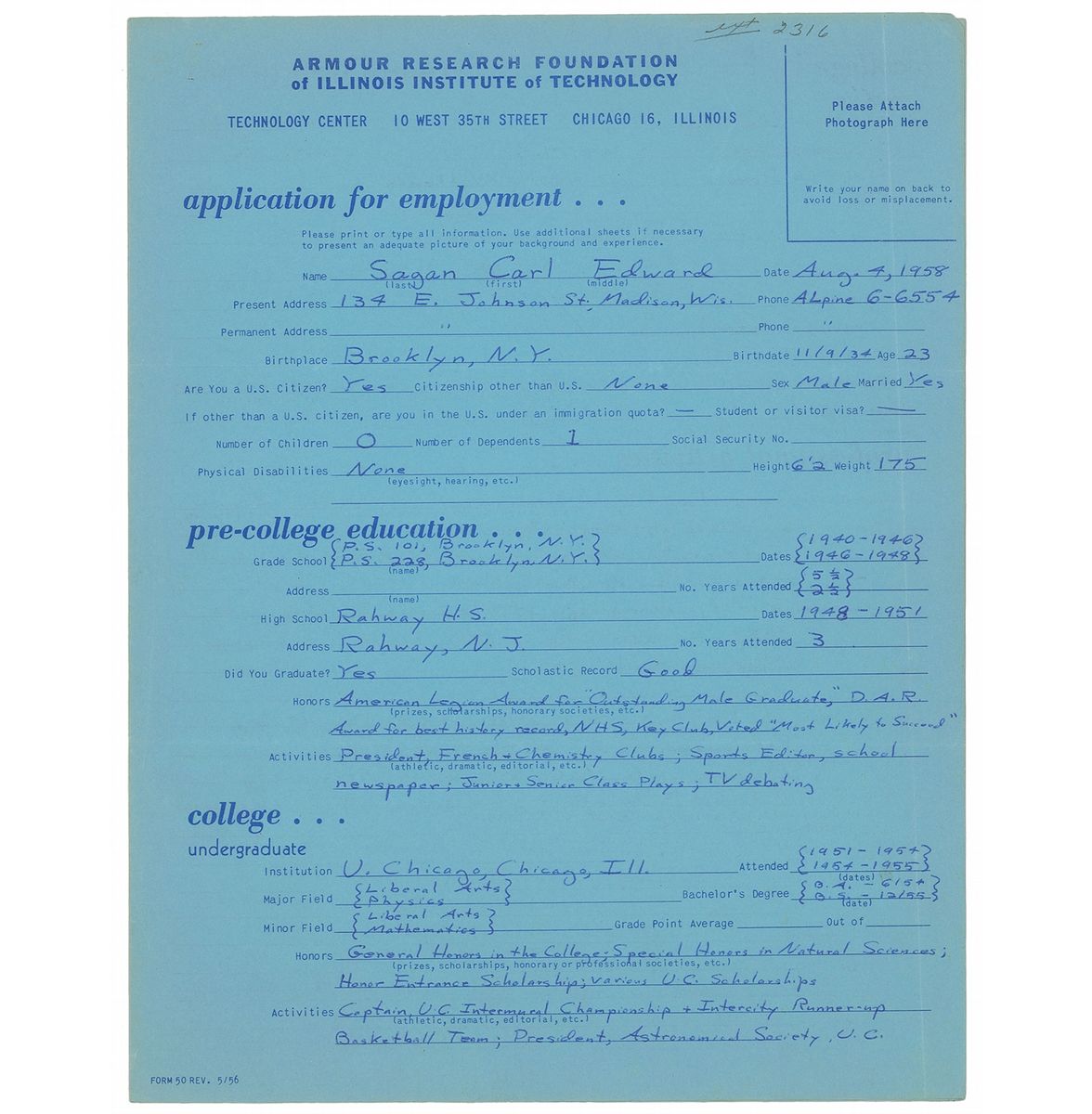 The earliest piece is Sagan's application for employment, filled out entirely in his own hand and signed at the conclusion, four pages on adjoining sheets, 8.5 x 11, August 4, 1958. Sagan provides his personal information, a lengthy description of his educational and employment history, and a list of references. He lists his undergraduate education at "U. Chicago, Chicago, Ill.," where he earned honors including "General Honors in the College; Special Honors in Natural Sciences; Honor Entrance Scholarship; various U. C. Scholarships," also noting that he was "President, Astronautical Society, U. C." He was still at the University of Chicago as a doctoral student at the time this was submitted. He continues to mention his published papers and lectures given, which include "'Radiation & the Origin of the Gene,'" "'Is there Life on Other Planets?,'" and "'The Problem of Life on Mars.’" His employment history lists several positions while studying at the university, with responsibilities such as "Research problem on star formation" and "Organized and moderated public lecture series on 'Creation of Life & the Universe.’" The references he provides are especially impressive, and include Nobel Prize–winning scientists H. J. Muller and Joshua Lederberg.