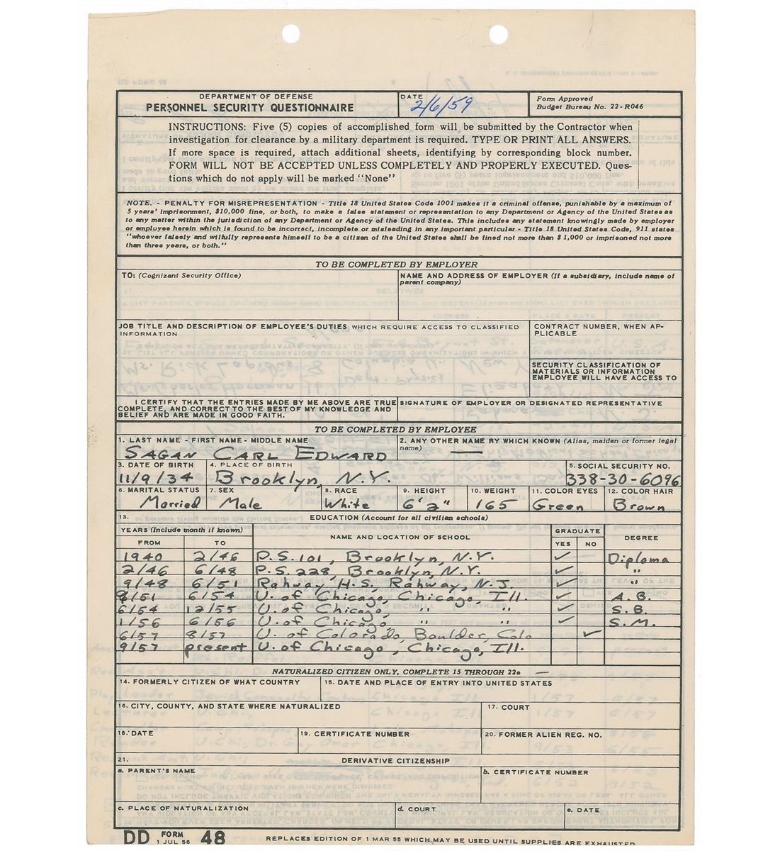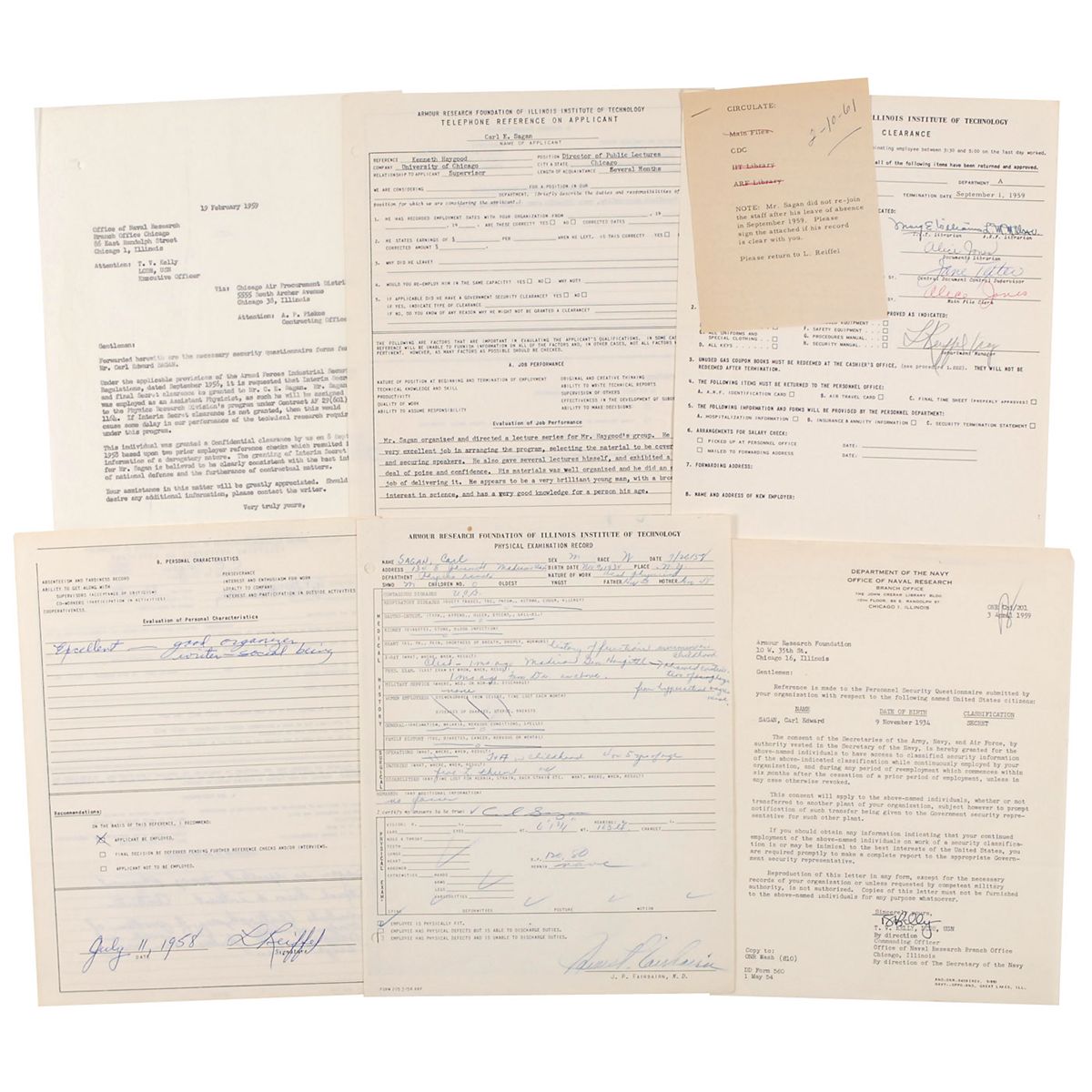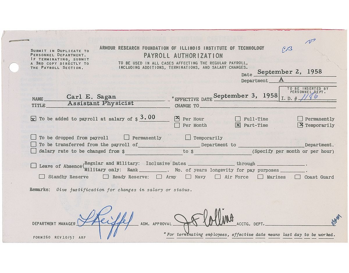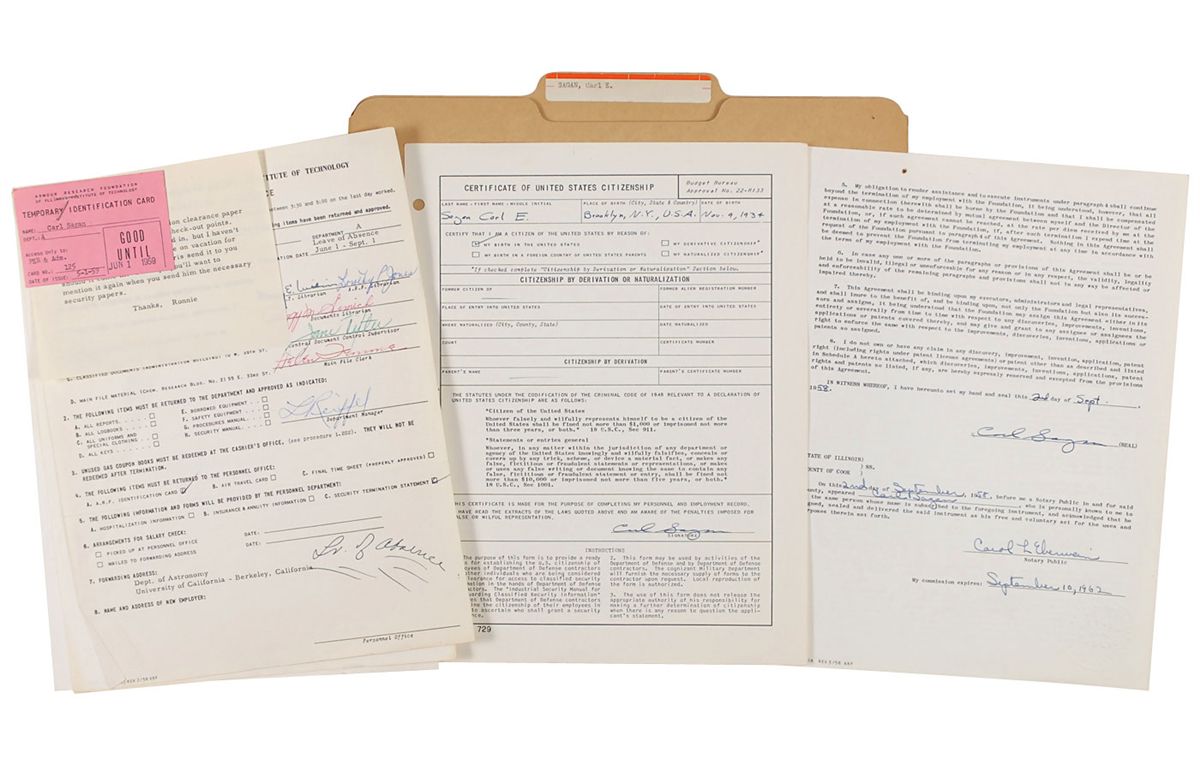 Remarkable and historically important archive comprised of Sagan’s personnel file from the time of his employment at the Armour Research Foundation at the Illinois Institute of Technology in 1958–59, during which time he worked on Project A119—a plan to detonate a nuclear bomb on the moon. The file includes his original job application, several documents concerning security clearances, various payroll cards and documents, and other general human resources documents.