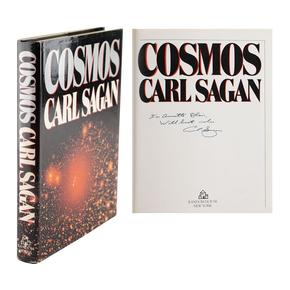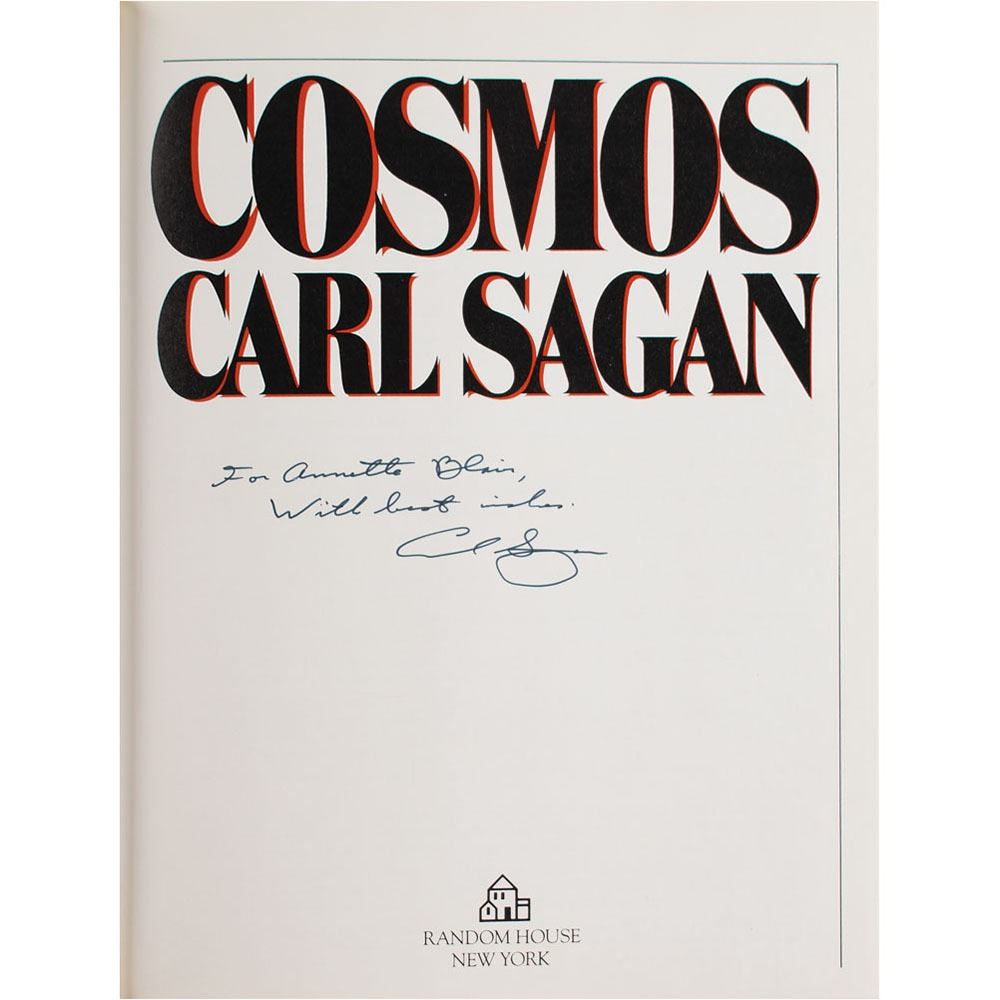 Signed book: Cosmos. Later printing. NY: Random House, 1980. Hardcover with dust jacket, 8 x 10.25, 365 pages. Signed and inscribed on the title page in black felt tip, "For Annette Blair, With best wishes, Carl Sagan." In fine condition, with a price-clipped front jacket flap.