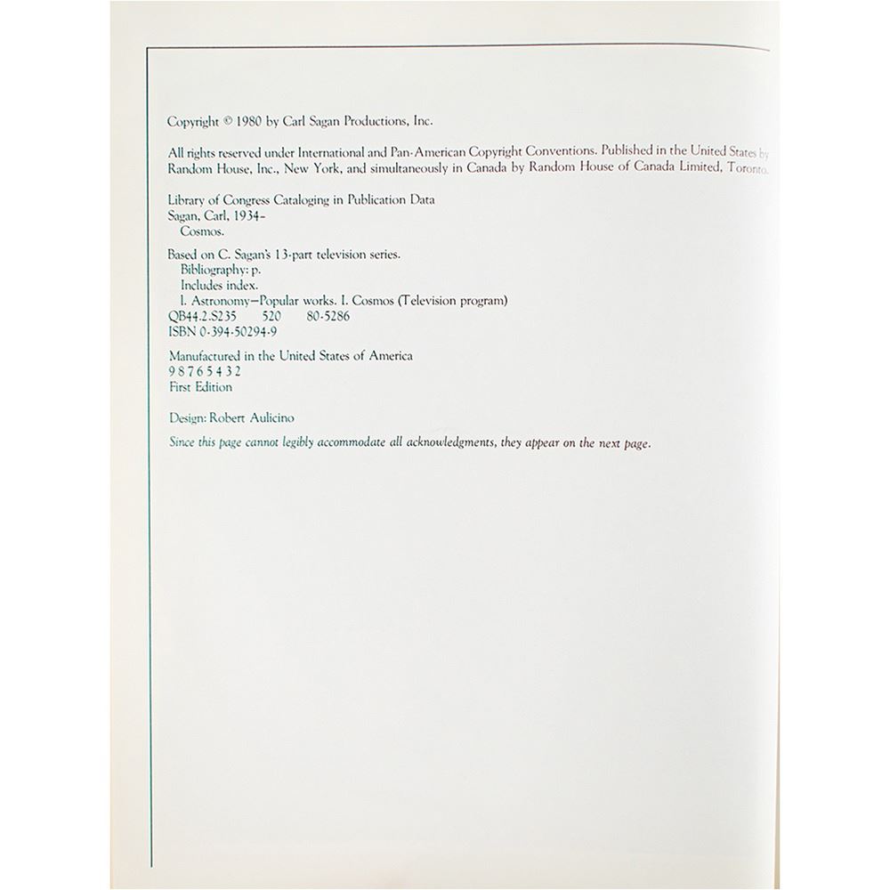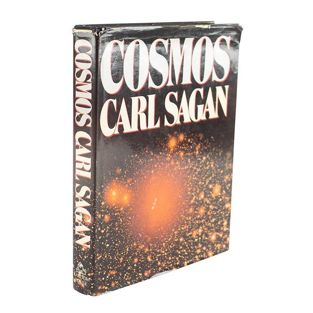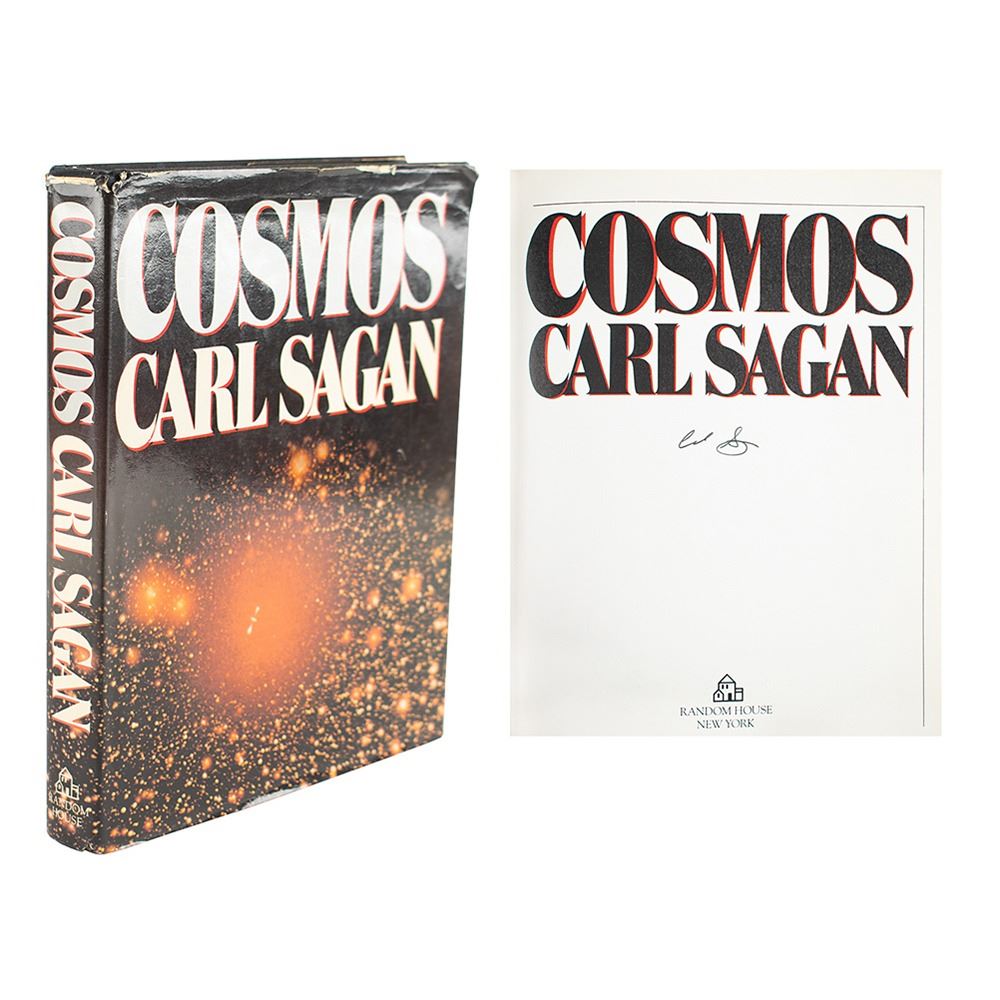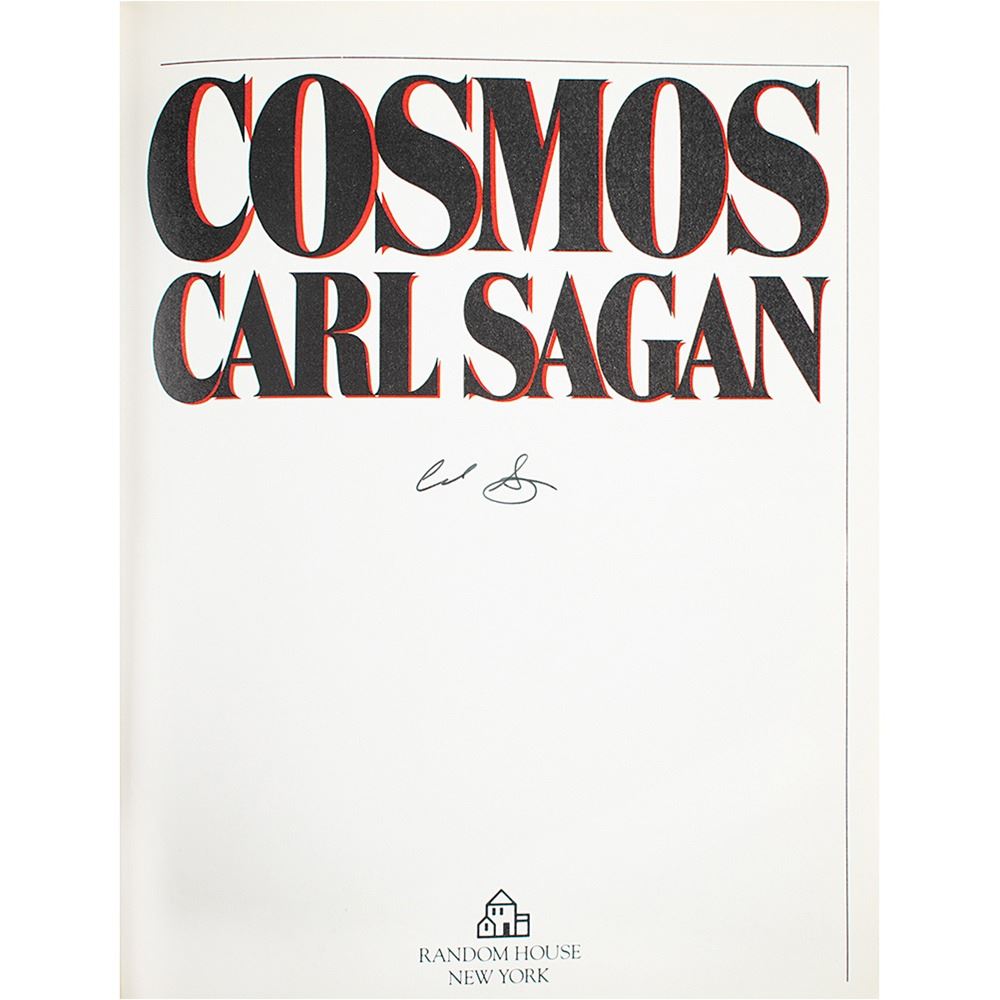 Signed book: Cosmos. First edition. NY: Random House, 1980. Hardcover with dust jacket, 8.25 x 10.25, 365 pages. Signed neatly on the title page in black ink by Carl Sagan. In fine condition, with edgewear to the price-clipped dust jacket.