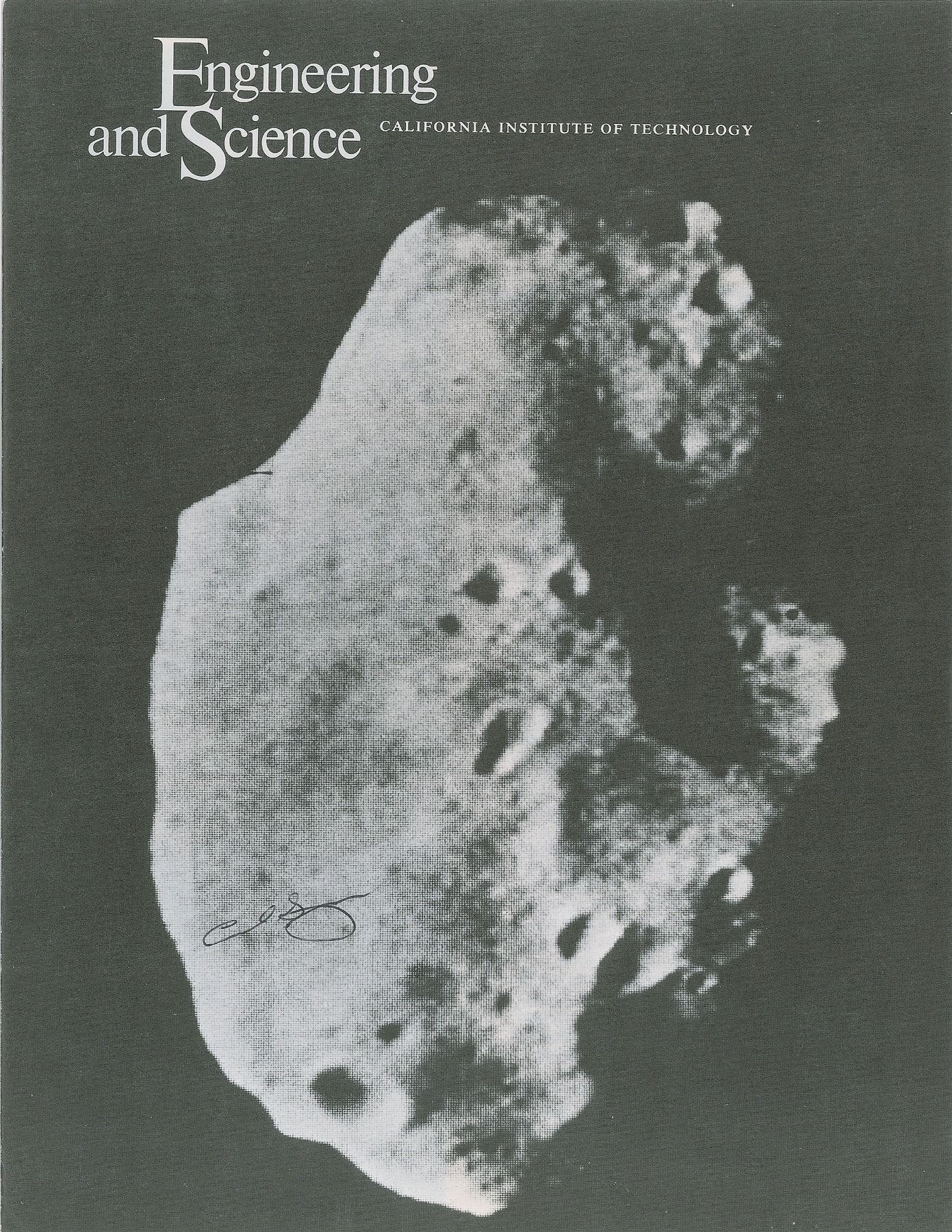 Booklet published by the California Institute of Technology in 1972, entitled "Engineering and Science," 8.5 x 11, nine pages, signed on the front cover in black ballpoint by Carl Sagan. The cover depicts an image of Mars' innermost moon, captured by Mariner 9. In fine condition, with creasing to the bottom edge.