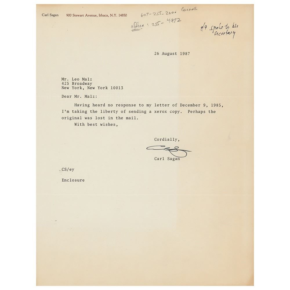 TLS, one page, 8.5 x 11, personal letterhead, August 26, 1987. Letter to Leo Malz, in full: "Having heard no response to my letter of December 9, 1985, I'm taking the liberty of sending a xerox copy. Perhaps the original was lost in the mail." In fine condition.