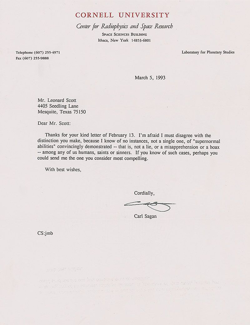 TLS, one page, 8.5 x 11, Cornell University letterhead, March 5, 1993. Letter to an admirer. In part: “I’m afraid I must disagree with the distinction you make, because I know of no instances, not a single one, of ‘supernatural abilities’ convincingly demonstrated—that is, not a lie, or a misapprehension or a hoax—among any of us humans, saints or sinners. If you know of such cases, perhaps you could send me the one you consider most compelling.” In fine condition. Accompanied by the original mailing envelope.