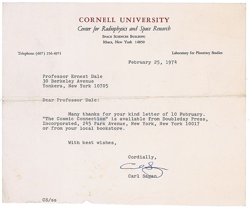 TLS, one page, 8.5 x 7 (bottom third likely trimmed off), Cornell University letterhead, February 25, 1974. Letter to Professor Ernest Dale. In part: “‘The Cosmic Connection’ is available from Doubleday Press…or from your local bookstore.” An insignificant area of paper loss to the lower border and some subtle foxing to the bottom, otherwise fine condition. Accompanied by an unsigned glossy portrait.