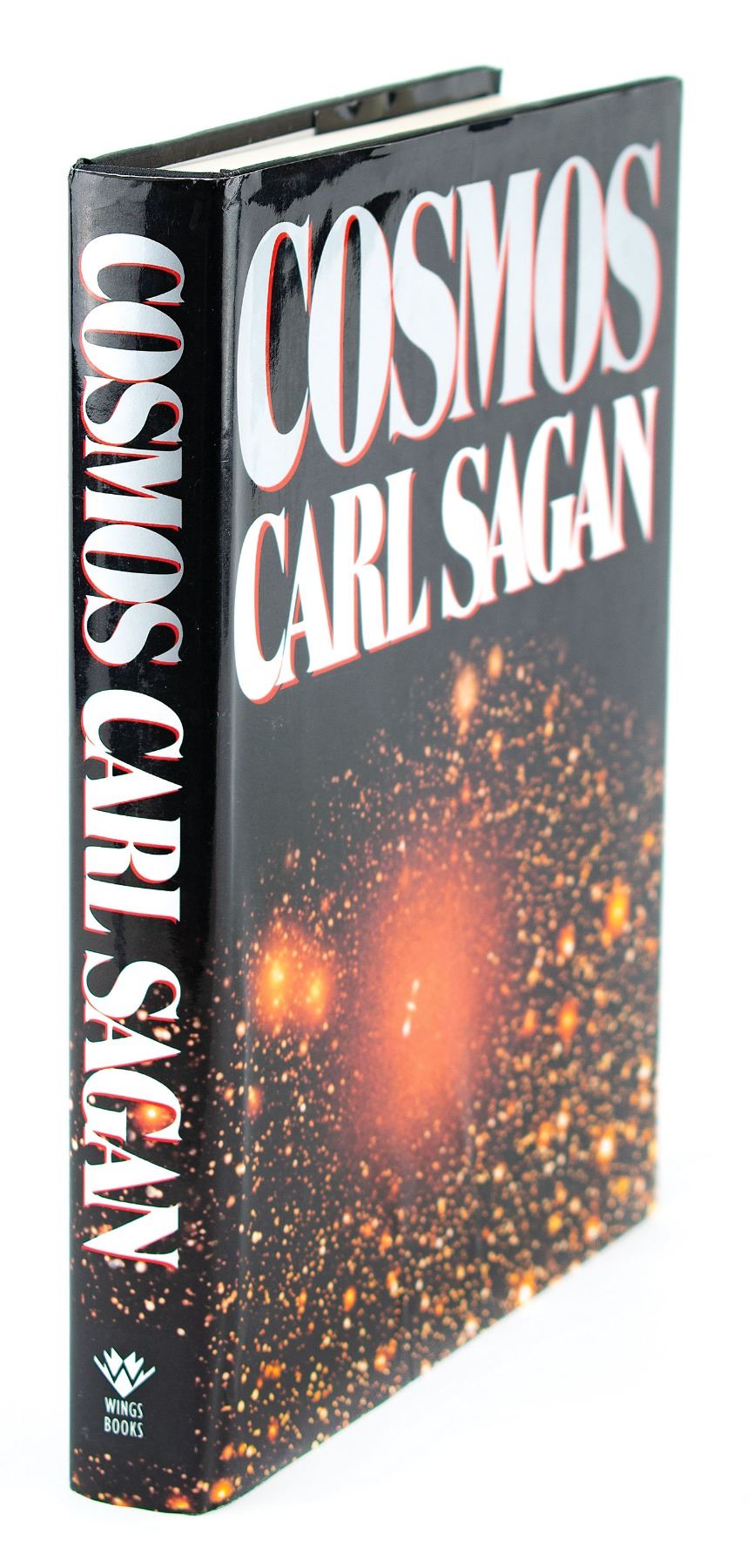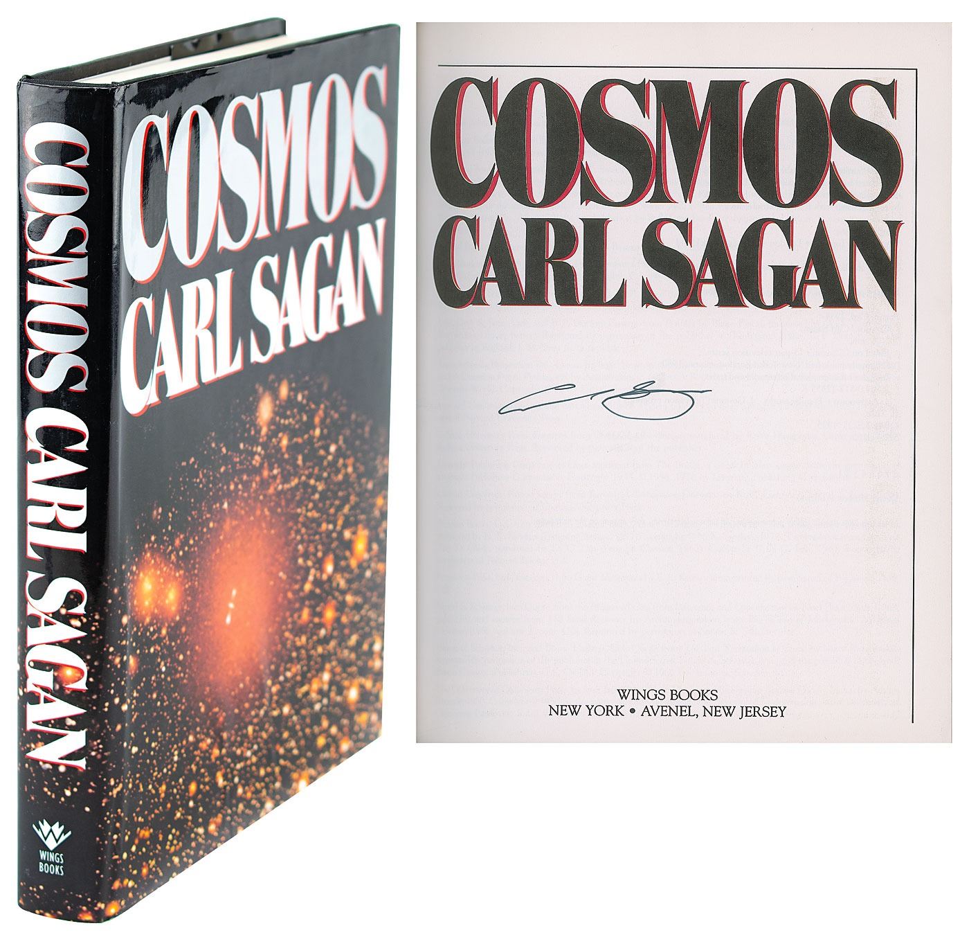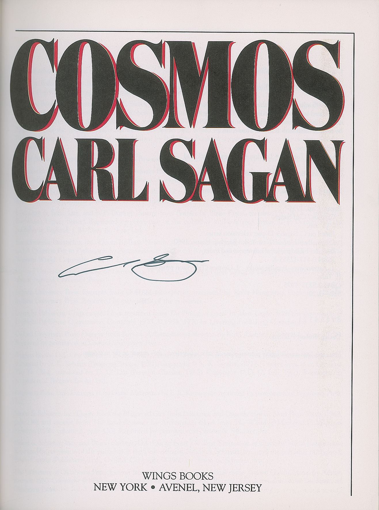 Signed book: Cosmos. Wings Books first edition. NY: Wings Books, 1995. Hardcover with dust jacket, 8 x 10.25, 365 pages. Signed on the title page in black ink by Carl Sagan. In fine condition.