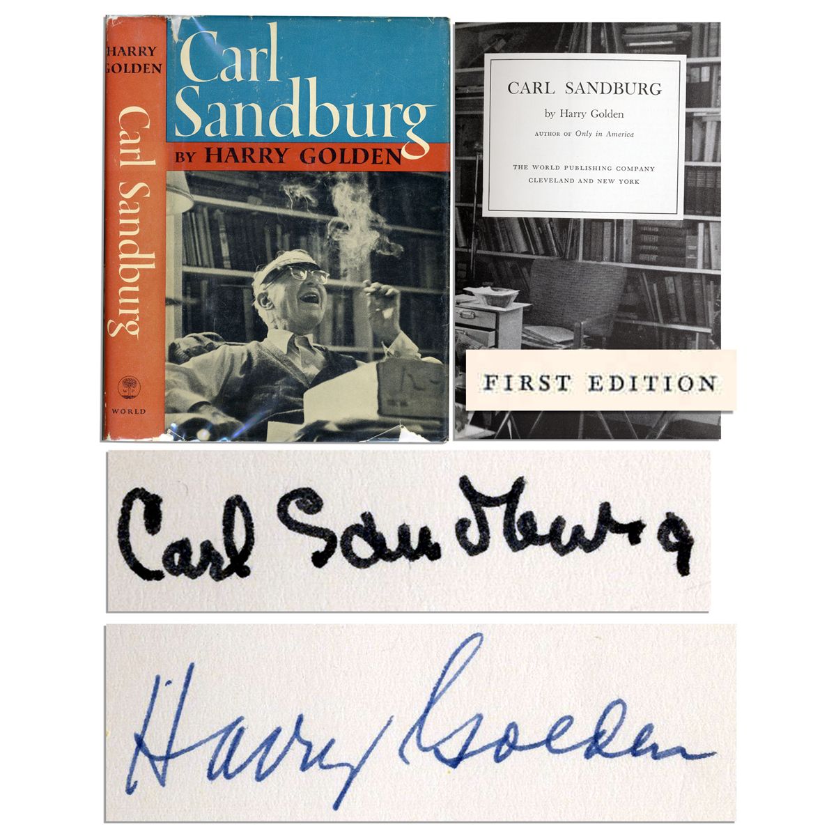 Carl Sandburg signed first edition of ''Carl Sandburg'' by Harry Golden. World Publishing Co.: Cleveland: 1961. The Pulitzer Prize winning poet and biographer of Abraham Lincoln signs, ''Carl Sandburg'' in black ink above the signature of the book's author, ''Harry Golden'' who writes a ''fascinating portrait of that eminent American, Carl Sandburg.'' Cloth bound book with gilt lettering is in very good condition; dustjacket has minor chipping and toning.